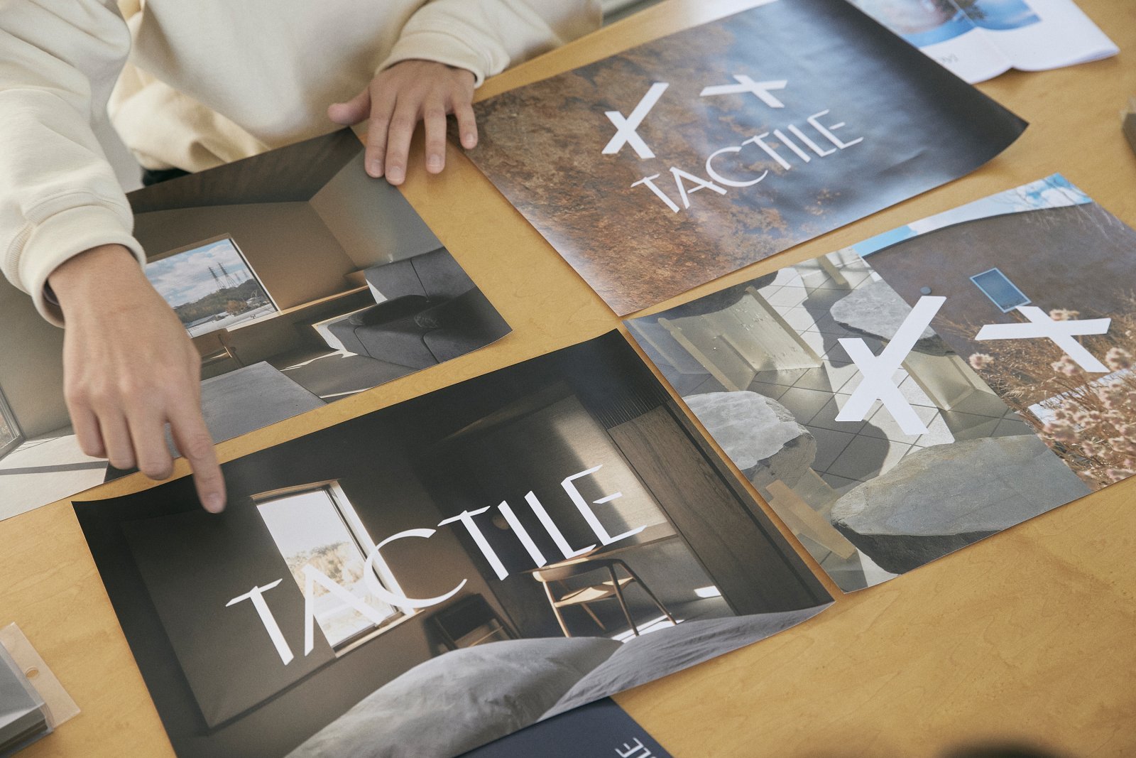 新しいところでは、2025年3月に中川政七商店と堀田カーペットが共同で立ち上げたブランド「Tactile(タクタイル)」のロゴなどのアートディレクションを担当。「日本では昔は漆塗りや和紙、織物、畳、佐官などの工芸技術を建材に取り入れていました。タクタイルとは触覚という意味。触りたくなるような工芸の質感を住まいに取り入れることで、生活がよくなることを目指している。『タクタイル』の英語表記にはTの文字がふたつあり、それを少しずらすことで工芸らしさ、家の形を表現しました」