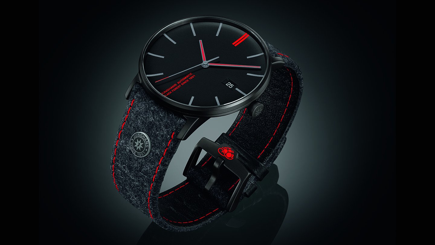 ドイツ南部でフランスに隣接するシュバルツバルトはドイツ語で「黒い森」を意味しており、針葉樹が密生する地域。この豊富な森林資源を活用した木製クロック製造が17世紀頃から活発になり、ユンハンスはその量産化で大成功を収めた。腕時計の分野でも世界初の電波時計を開発するなど、高い技術力に定評がある。160周年記念モデルは、こうした同社の発展を長く見守ってきた地域への感謝が込められている。
