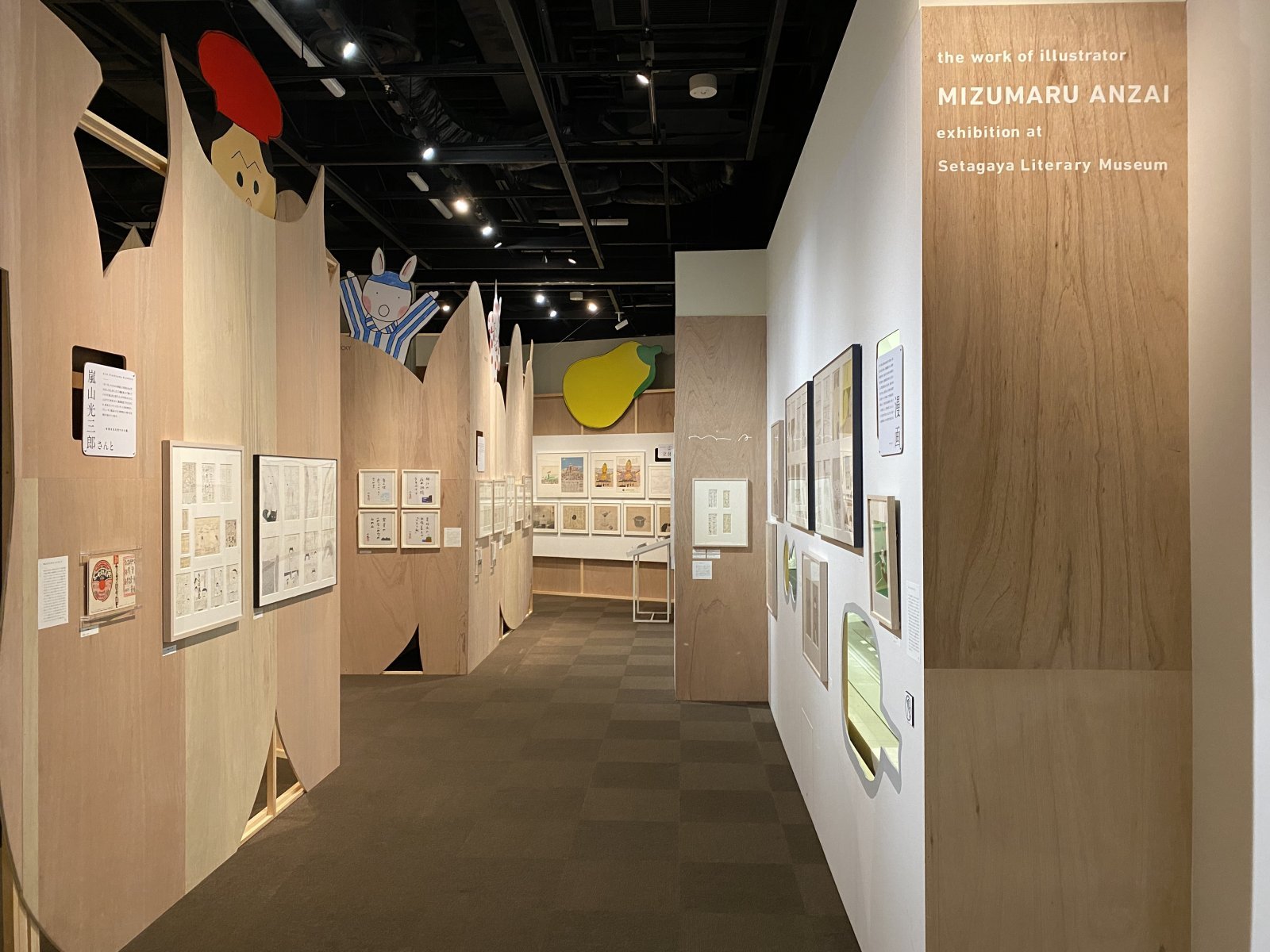 デザイン事務所「DO.DO」(ドド)による会場構成が面白い。壁に安西が数多くコレクションしたスノードームなどのモチーフを描いたり、覗き穴や顔はめスポットなどを設置。さらに展示室内に安西を象ったパネルやシルエットが8カ所ほど隠れている。細かく区切った順路も自由なスペースは、ちょっとした迷路を彷徨うようで、冒険心すらくすぐられる。作品を見れば見るほど、奥へ進めば進むほど、安西のイラストレーションの世界の中へどんどんのめり込むような空間が築かれている。