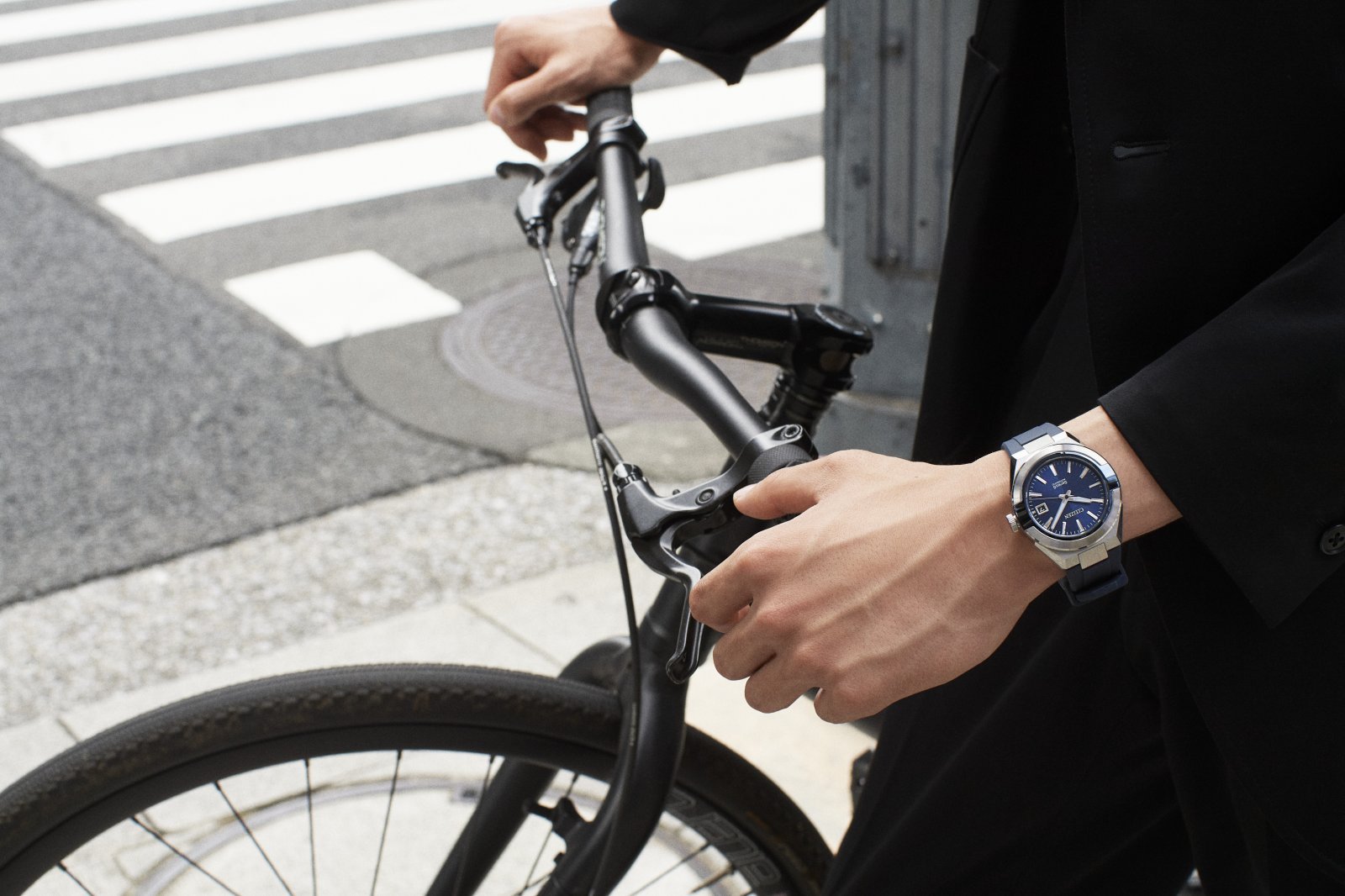 ブルーの文字盤が爽やかな印象のモデル。ウレタン製のベルトは質量が軽く、スポーツアクティビティとの親和性が高い。「シリーズエイト」は、すべてのモデルが10気圧防水。日常生活用の強化防水仕様なので、ゲリラ豪雨や水仕事にも耐えられる。とはいえ防水の効いたケースの中では繊細なメカニズムが稼働しているので、落下などさせないように注意を払うのは、機械式腕時計を使用する上での基本的なルールだ。