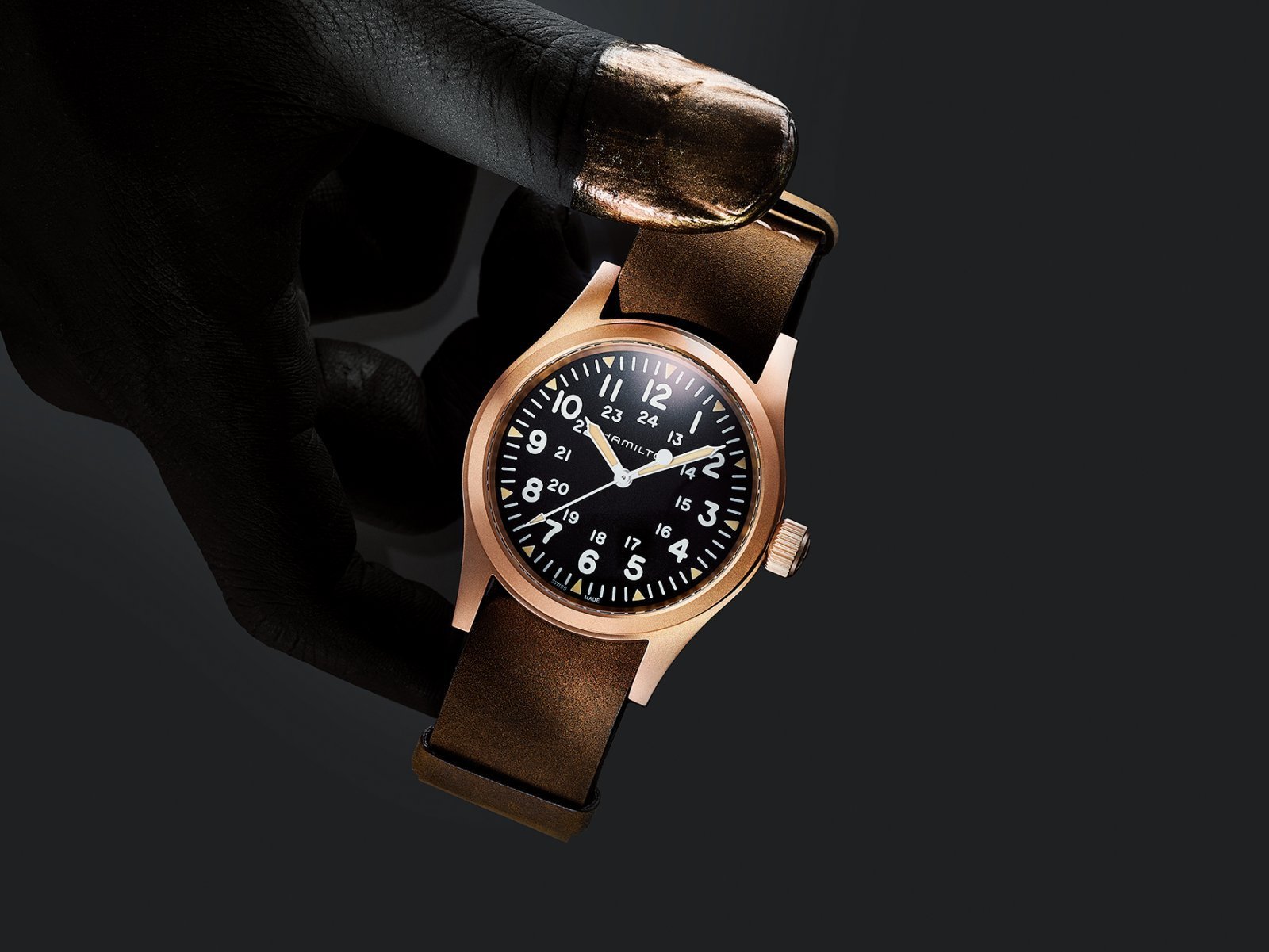 HAMILTON[ハミルトン]/カーキ フィールド メカ ブロンズ。ダークな文字盤に純白の秒針、オールドラジウムカラーのスーパールミノバを塗布した時分針と三角形のアワーインデックス。1960年代のオリジナルモデルを忠実に復刻したミリタリーウォッチの硬質な美学に、「カーキ フィールド」で初となるブロンズケースを纏わせると、印象が一変。革製のNATOストラップで精悍さも引き立つ。ケースバックは堅牢なチタン製。手巻き、ブロンズ、ケース径38㎜、パワーリザーブ約80時間、カーフ革NATOストラップ、5気圧防水。¥105,600/ハミルトン TEL:03-6254-7371