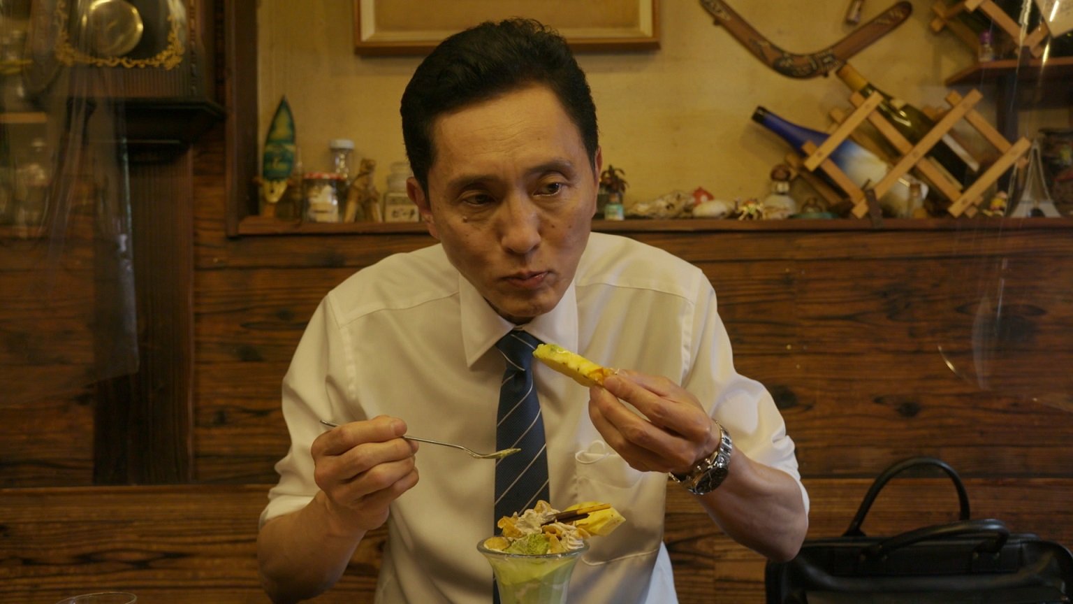 だって五郎は、空き時間に溜まっている仕事をするために入ったはずなのに、オリジナルパフェを見つけるやいなや「仕事どころじゃない」「これは片手間にはできんぞ」と開いたばかりのノートPCをしまい、わざわざお店の人に紙とペンを借りてまであみだくじに興じるのだ。その結果、宇治抹茶アイス、パイナップル、マロンソース、コーンフレークという奇抜な組み合わせになっても、迷わずその通りに注文する。