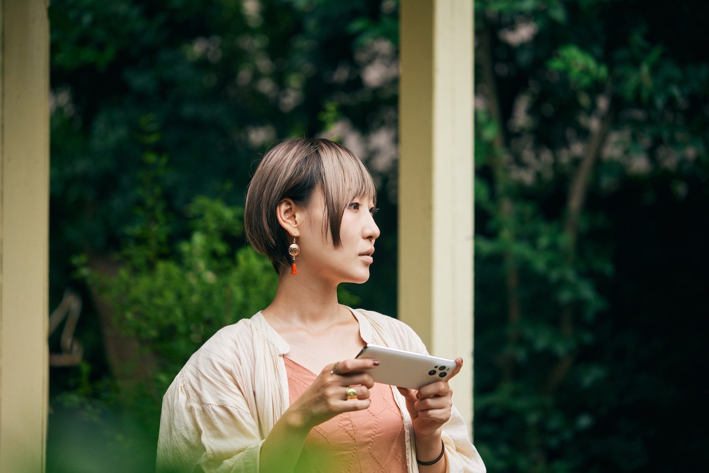 古性がOPPOブランドのスマートフォンOPPO Find X3 Proを手にし、最初に気に入ったポイントは、外観のバランスよく整ったシェイプと質感だ。「テーブルフォトの撮影で小物のひとつとしてスマートフォンを添えることがありますが、そんな時にOPPO Find X3 Proは被写体として撮りたくなるビジュアルだと思います。ホワイトの質感も、貝殻みたいで好きです」