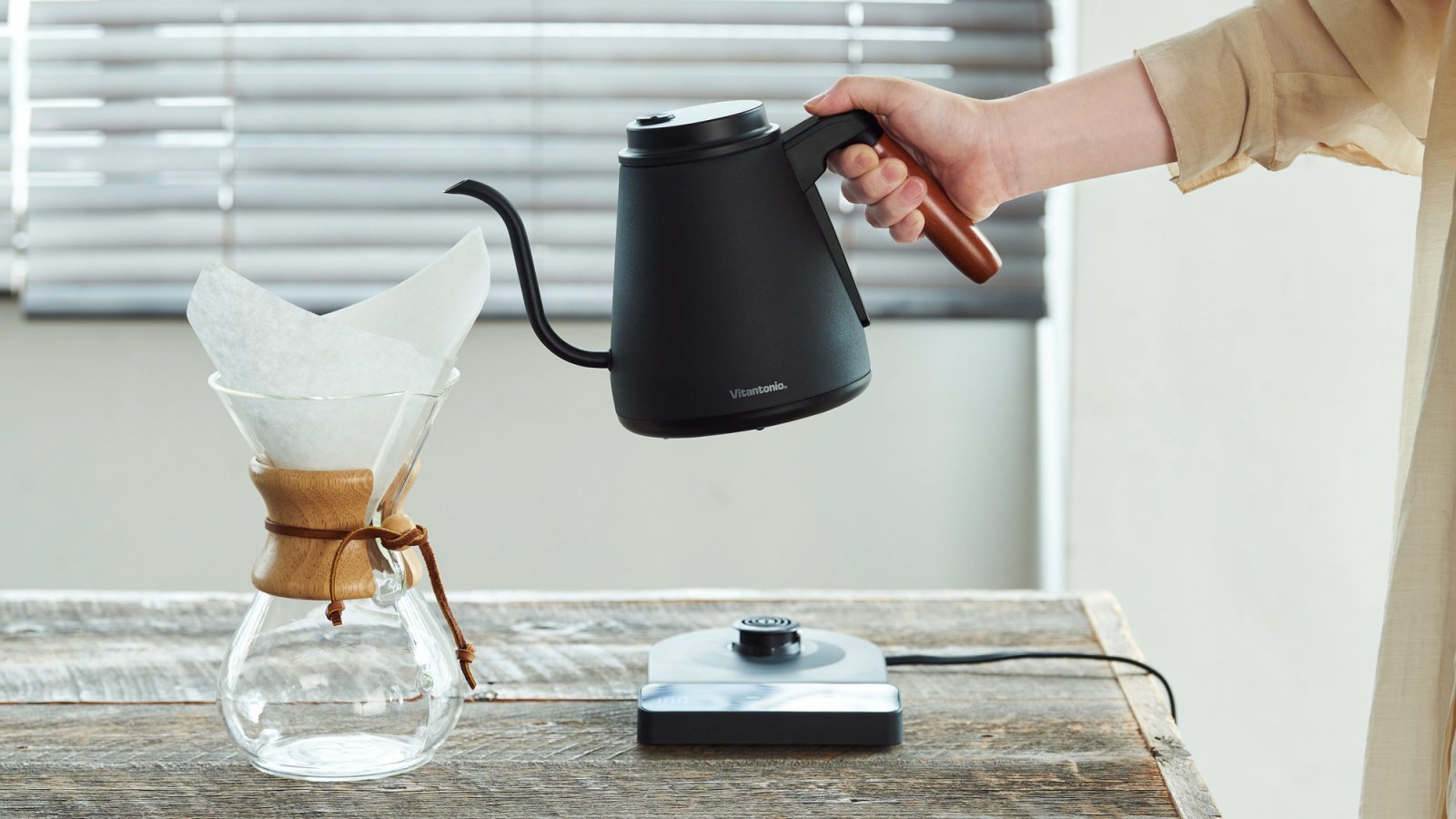 オープン価格で想定¥14,850(税込)はコーヒー用電気ケトルとしては高価な分類でも、それだけの利便性が期待できる製品だ。洒落心のあるデザインに定評があるビタントニオらしい、モダンキッチンと調和する佇まいも見逃せない。