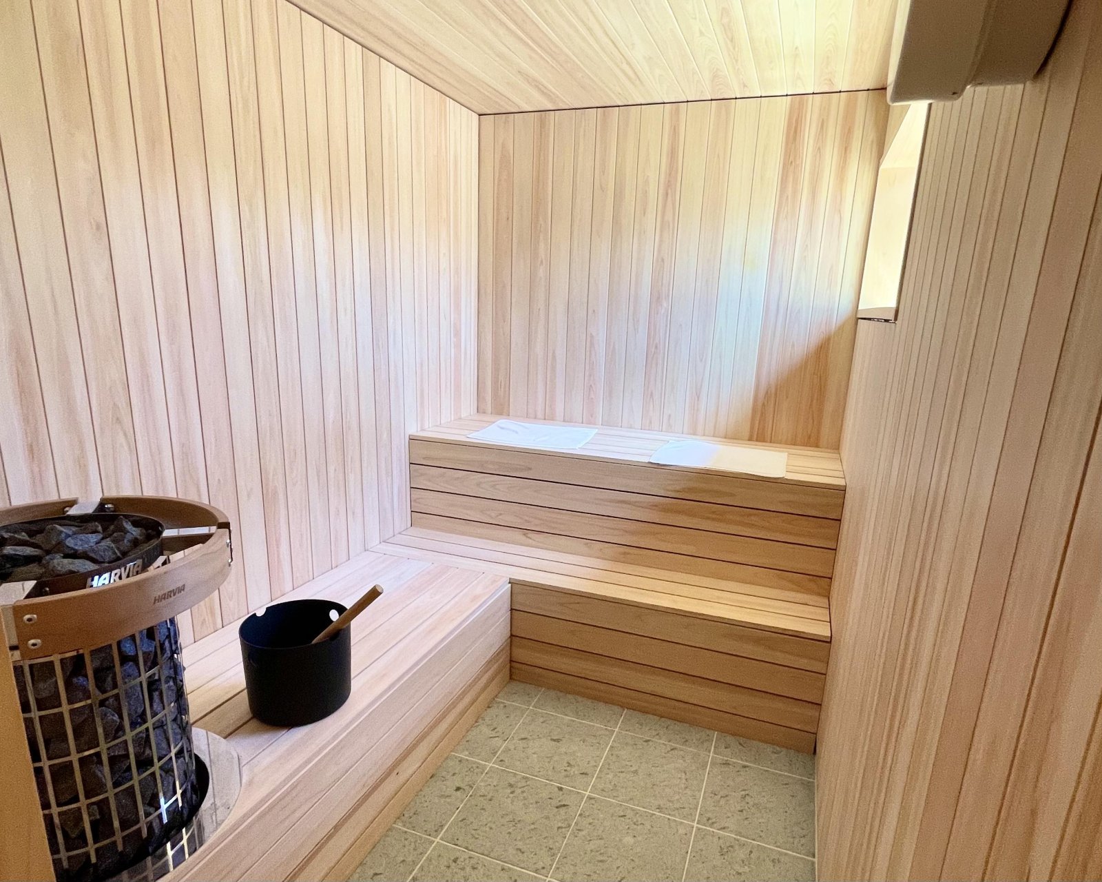 フィンランド製のストーブHARVIAが鎮座しています。まだ新しい木の香りを胸いっぱいに吸い込んで、窓のそよそよ揺れる森の葉を眺めてロウリュ。蒸気が気持ちいい!