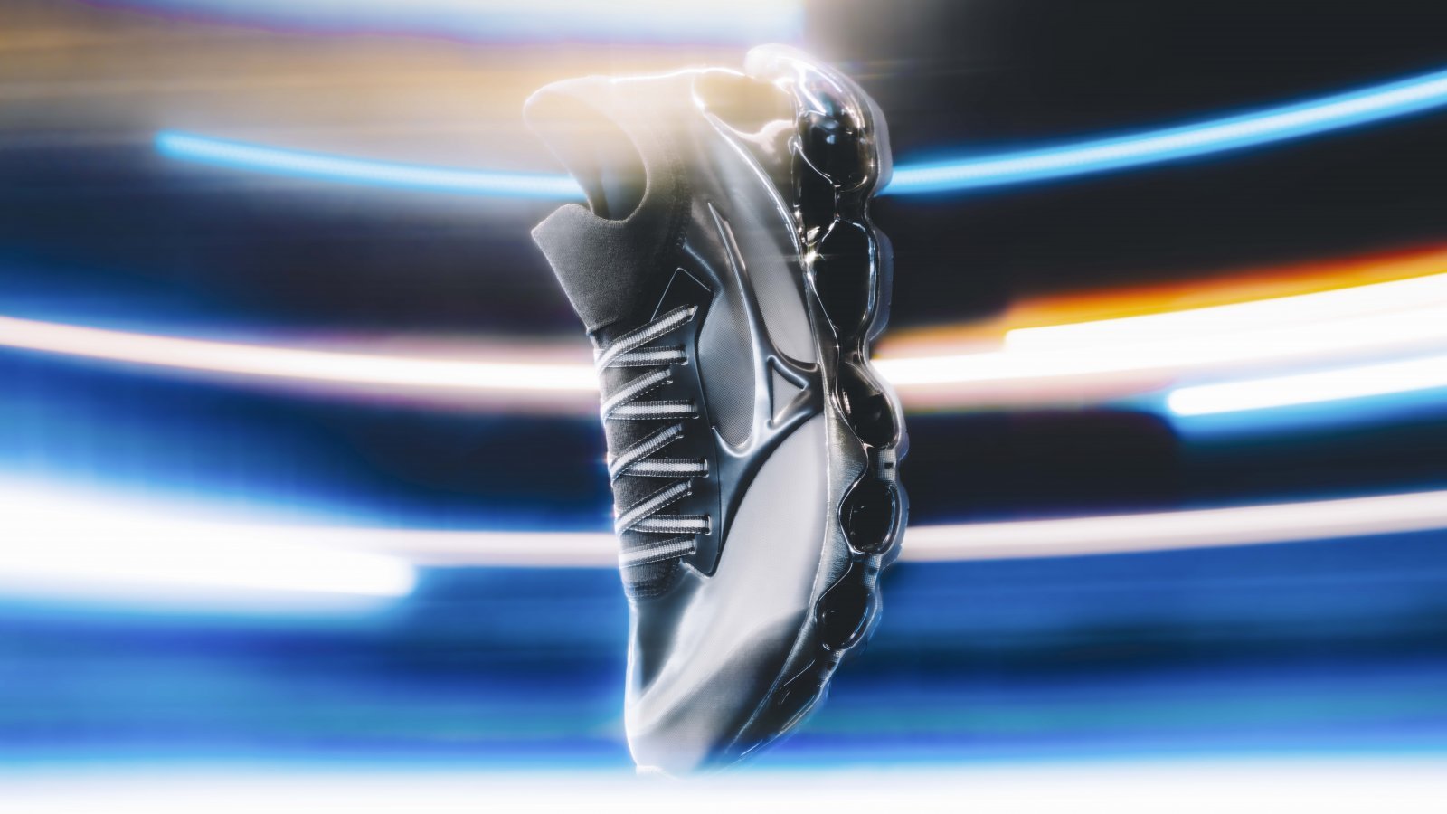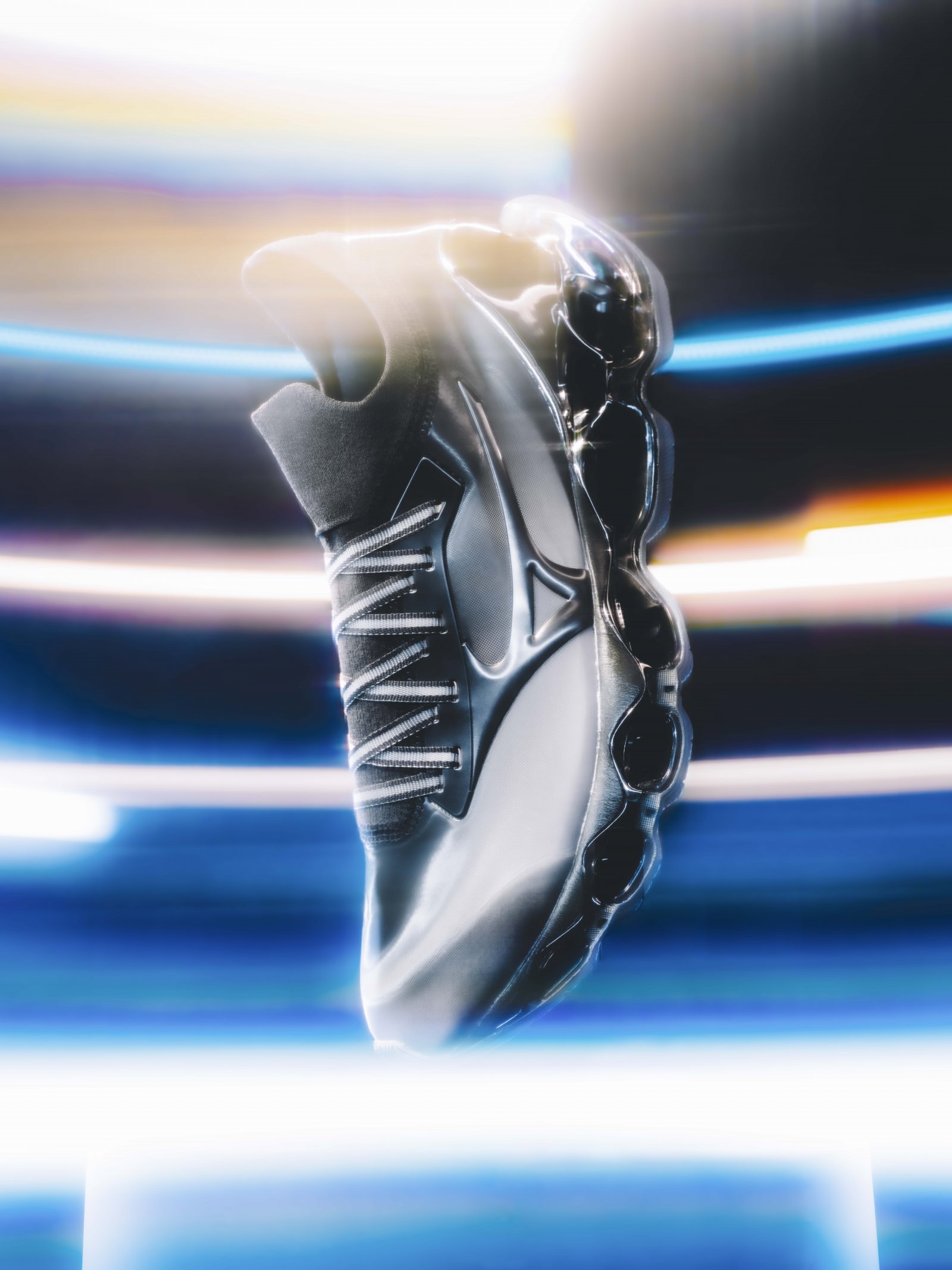 今回空山がデザインを手掛けた「WAVE PROPHECY SORAYAMA」は、ミズノの革新的な技術を結集し、独自の進化を遂げたソールユニット「INFINITY WAVE」を空山監修のもとアップデートしたもの。従来のものに比べて軽量になり、屈曲性も向上。機械的でありながら肉感的な空山基のアプローチが掛け合わさり、まるで宙に浮いているようなアーティスティックな一足に仕上げられている。