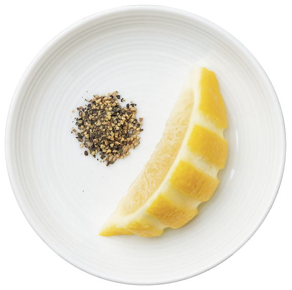 餃子を食べ進めるうち、口の中がややオイリーになってきたなと感じた時にお薦めのタレ。さわやかなレモンの酸味と香り、黒コショウの刺激が口の中をリセットしてくれる。