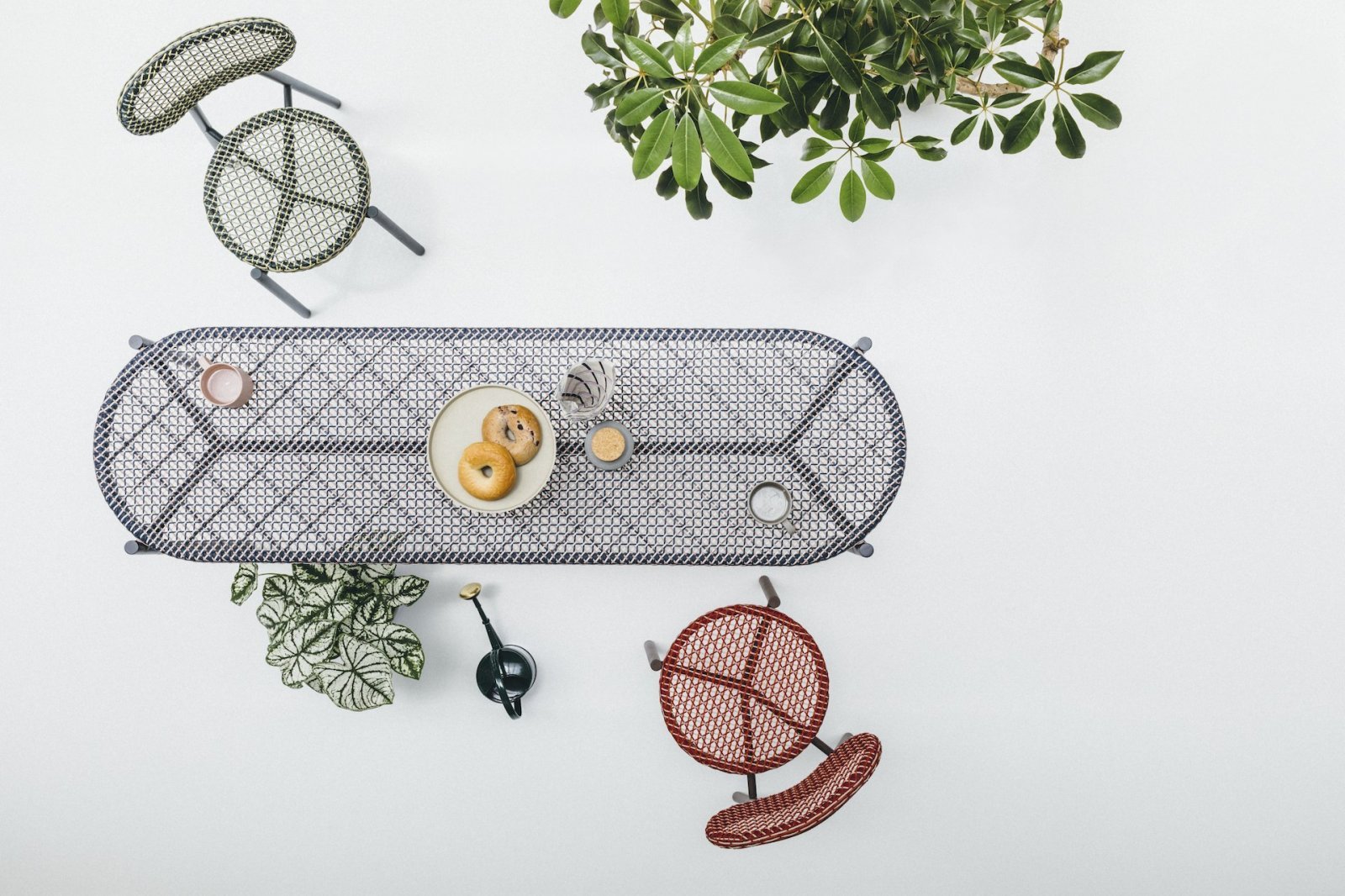 また、オリジナルで開発した3色の人工ラタンをハンドクラフトで編み込んでいるため、単色では出すことのできないニュアンスを実現。見る角度や距離、周囲に置いてあるもの、陽の光などで異なる印象を楽しめる。