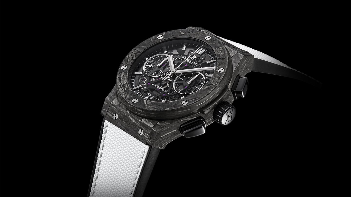 遠目でもわかる独特の形状と圧倒的な存在感。いかにも機械式らしい雰囲気を放つウブロの時計は、「The Art of Fusion」(異なる素材やアイデアの融合)を旗印として、これまでなかったマテリアルを意欲的に開発・導入。素材の博覧会といっても過言ではない豊富なバリエーションを展開してきた。今年の新作「アエロ・フュージョン クロノグラフ フロステッドカーボン」も、モデル名にあるようにカーボンをケースとベゼルに採用。フロステッド=まさに凍ったような印象を与える模様が時計を覆っている。