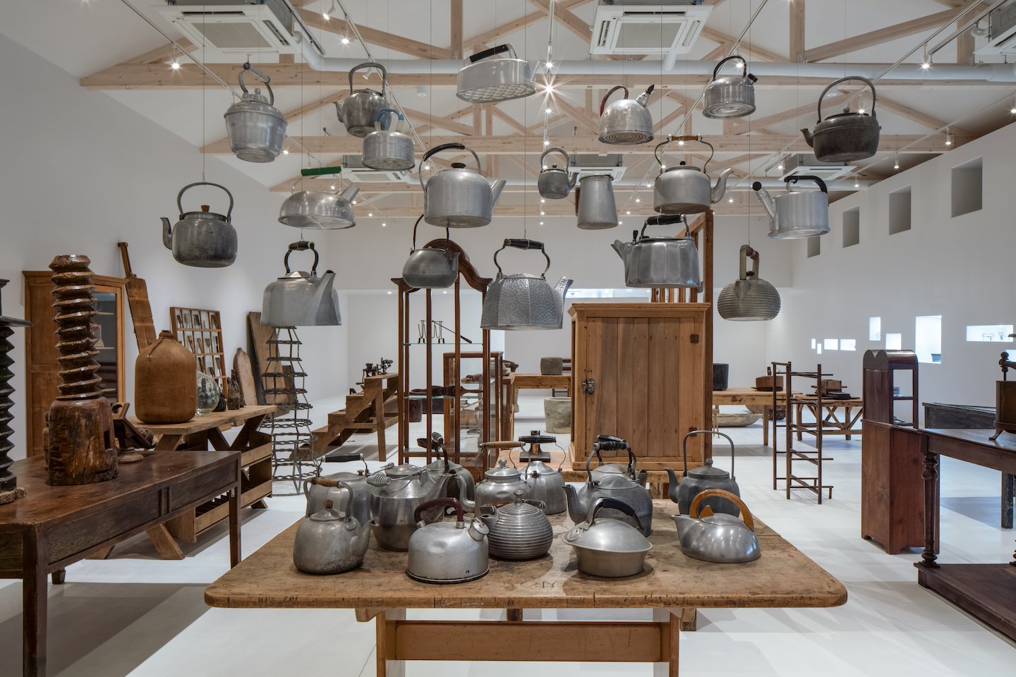 同じく「サンセバスチャン通り」にミュージアムをオープンしたのは、奈良で38年間続く、ライフスタイルショップの先駆け「くるみの木」。入り口には、代表の石村由起子が16歳の時に骨董市で出合った蕎麦猪口や祖母が愛用した菓子焼き器など、「私の暮らしの教科書のような大切な存在」というアイテムを展示する。