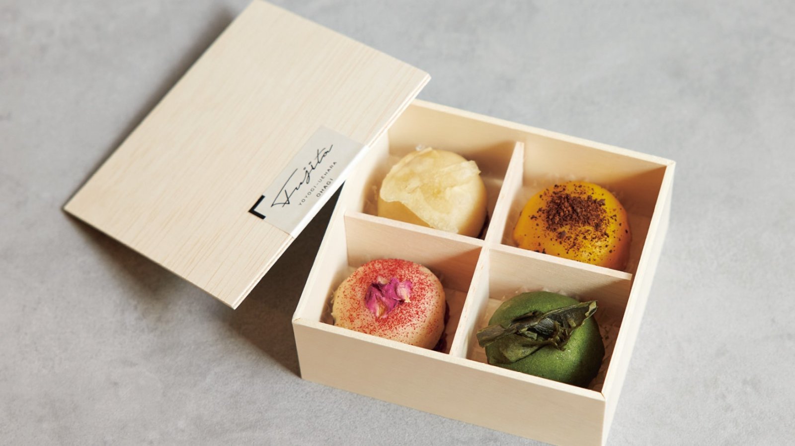 10種ほどのフレーバーを展開するあんは、自家製白あんがベース。北海道産の手て忘ぼう豆を炊き、甘みを極力控えることで、それぞれの素材の香りが活きる。抹茶の濃い香りが口中に広がる「抹茶とワカメ」は、小豆島の塩昆布を忍ばせ、瀬戸内の板ワカメをトッピング。抹茶と海藻の旨味が見事に融合する。木箱に入った4種のカラフルなおはぎは、秋の手土産に最適だ。