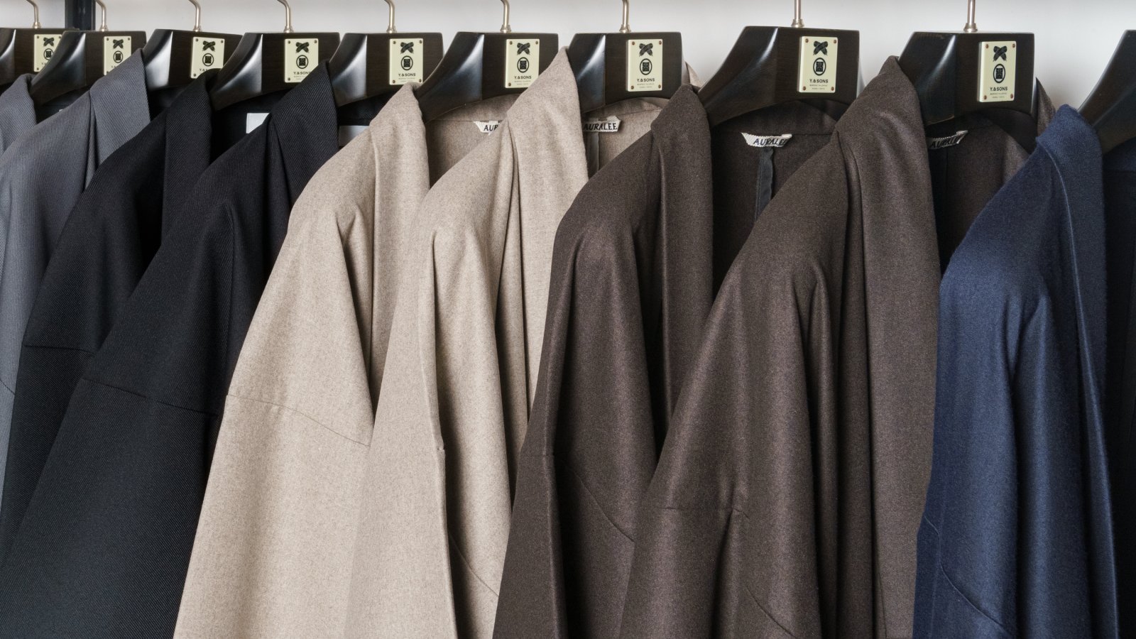 着物が洋服と比べてもっともシルエットが異なるのが袖幅だ。肩が落ち脇下から袖口まで極度に太くなっている。そこでY. & SONSは着物の上に着られる特別な形のコートをラインアップしている。コモリのアイコンモデルのタイロッケンコートが代表的で、今季は洗いを掛けたこなれた風合いのモデルが初登場。北欧ノルウェーの防水コートブランド、ノルウェイジャンレインの「リヴ ゴーシュ」も和装に合わせた初別注品だ。オーラリーのウールコートも初別注品で、通常モデルの袖幅を大胆にモディファイドしたもの。