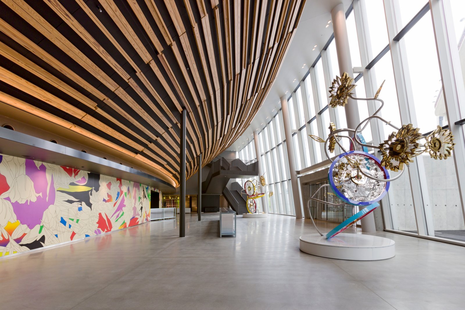 まず⽬に⾶び込むのは、左右に対に設置された⾼さ約4.5mの迫⼒ある彫刻2作品。ホワイエ奥の壁⾯には、幅約30m、⾼さ2.5mにおよぶ壮⼤な壁画が⼀帯を包んでいる。作品から、盛者必衰・輪廻転⽣・起死回⽣といった⼈間の営みや⽣命⼒、超えるべきハードルや挑戦の連鎖があって我々は存在するというリアリティや、持続やプロセスの中で⾃⼰発⾒や⾃⼰成⻑を遂げる我々⾃⾝の存在に問いかける意図を感じ取ることができるだろう。