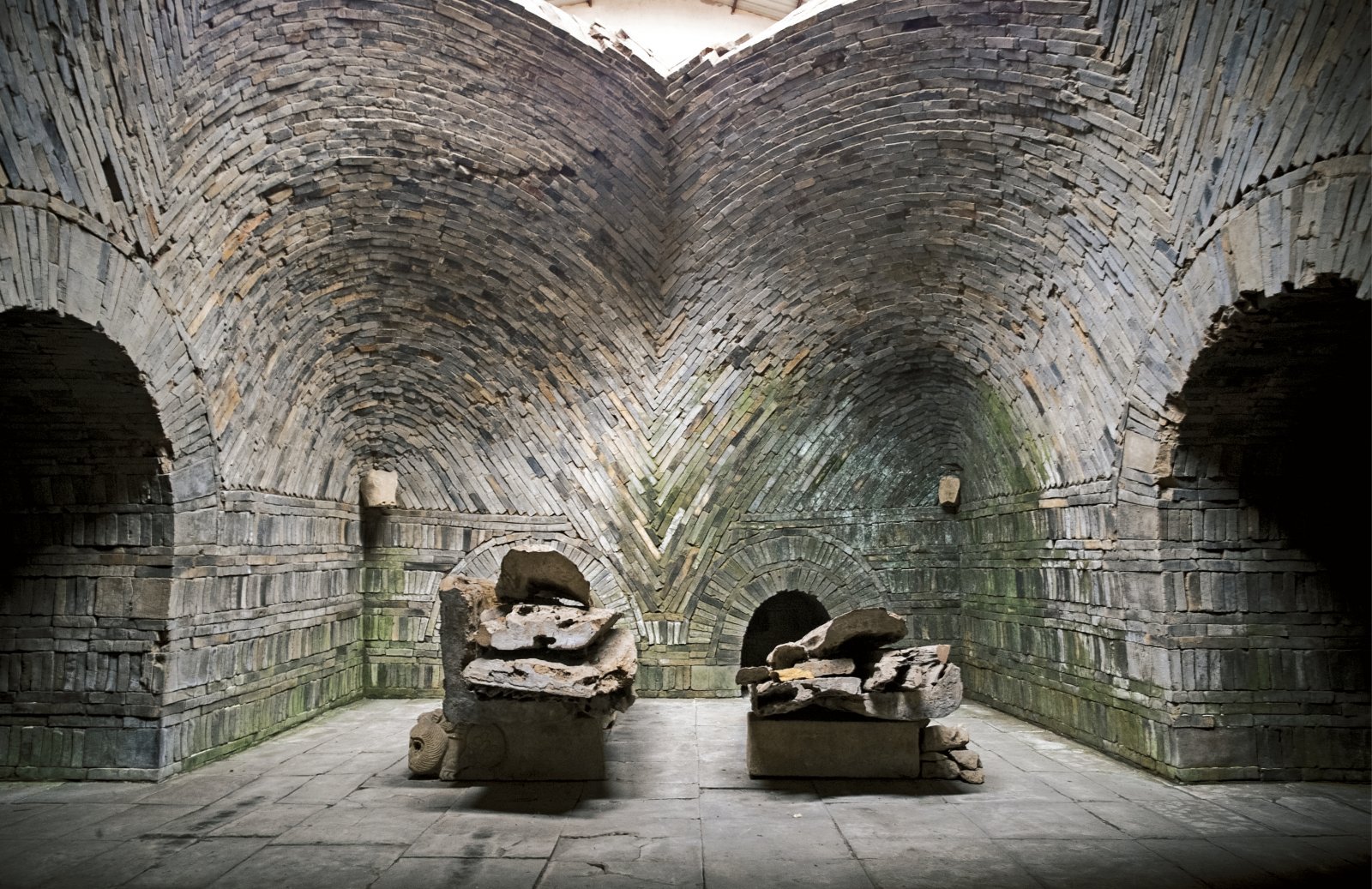「ドーム型の墓は、これまで発見された呉の墓の中でも大変珍しい。河南省安陽市で見つかった曹操の墓は、規模こそ大きいのですが、磚の積み方は単純です。魏ではせいぜい縦と横の組み合わせですが、呉では斜めに積み上げる技術があり、このなんとも言えない丸みを帯びた壁をつくることができました。また墓室の四隅を見ると1号墓(后室)では牛の頭をかたどった巨大な石をガツンとはめていて、これも大変珍しいものです」