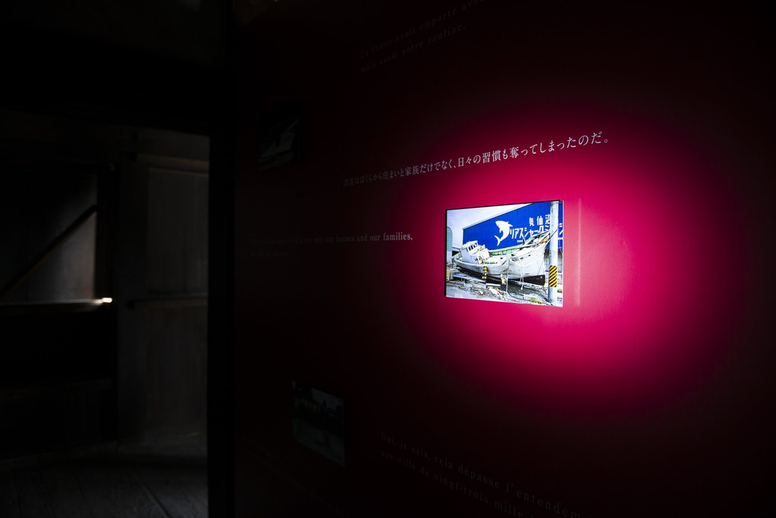 堀川通に面した東大手門から二条城に入り、まず東南隅櫓に向かう。シャネル日本法人会長であり、日本で6編、フランスで5編の小説を刊行している小説家でもあるリシャール・コラスの写真とテキストが展示されている。展示タイトルは『波——記憶の中に』。震災の1ヶ月後に東北を訪れ、「SMILE IN TOHOKU」というメイクアップ・サービスのボランティア活動をシャネルとして実施したコラスは、自らの記憶のために撮影を続け、出会った人々の語りに基づく小説『波』を2012年3月に刊行。避難所を想起させるこの暗い展示空間では、鑑賞者は懐中電灯を持ち、『波』のテキストと当時の写真を追いかけながら震災の記憶を感情の深いところに刻みつけていく。