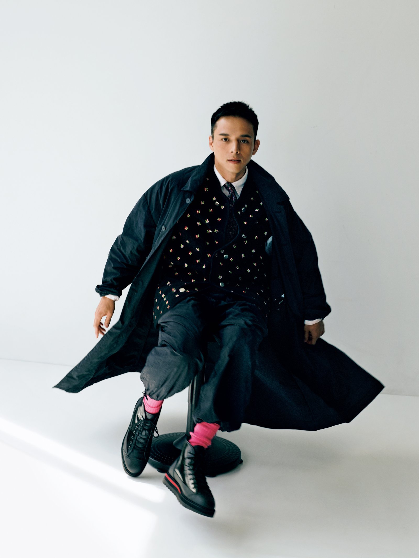 「品よく黒でまとめながら、エナメルとラバー をミックスしたデザインは、かっちりしたスタ イルにも履けるし、今日のクラシックな着こなしにも映えます。僕は、シンプルな服装に色や柄を使った靴下を合わせるのが好きなので、アクセントになっているかかとの赤いラインに合 わせる靴下を選ぶのがすごく楽しくて。いつも『今日はどう楽しみます?』と問いかけられて るような、そんなワクワクする靴なんです」