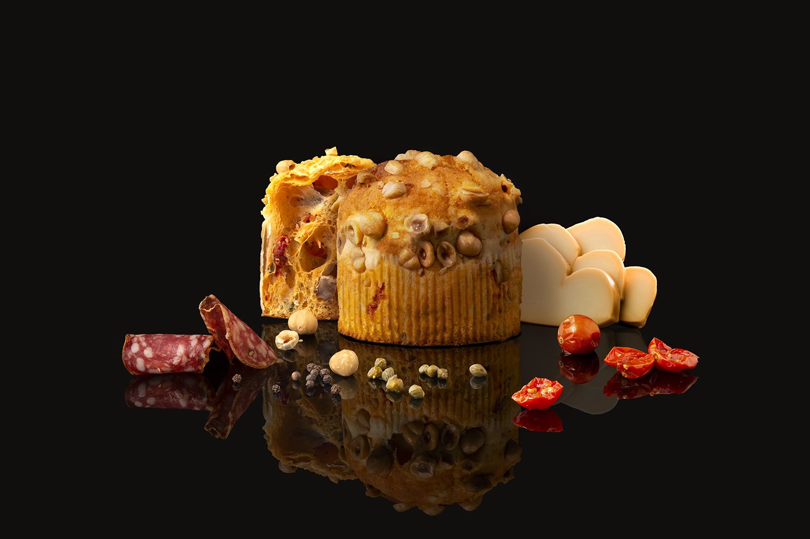 もちもち、ふわふわとしたやわらかい生地と、イタリアを代表する食材それぞれの旨味を存分に楽しめる「パネットーネ・サラート」。断面からもわかるように、一口目はジューシーさが閉じ込められた大きなサラミが印象的。他にも、生地と混ぜ合わせているスカモルツァ・アフミカータのスモークチーズ、ケッパーの酢漬け、ドライチェリートマトも後を引く味わい。トッピングにはピエモンテ産のヘーゼルナッツ、ポレンタというトウモロコシの粉とグラナパダーノの粉チーズを使用し、香ばしいだけではなく、食感も楽しむことができる。