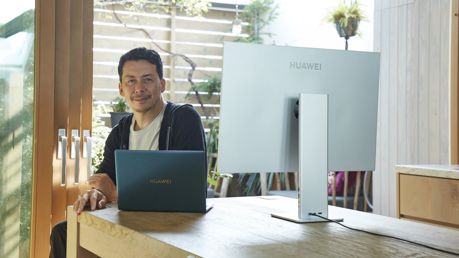 「僕のパソコン歴は40年近くになりますが、ここ数年ですごく進化していて、少し前では夢みたいなことがスマートフォンやノートPCで可能な時代。本当に素晴らしいと思います」。今回、桐島に触れてもらったファーウェイのスマートデバイスは、ノートPCのHUAWEI MateBook X Proと大型モニターのHUAWEI MateViewの組み合わせだ。