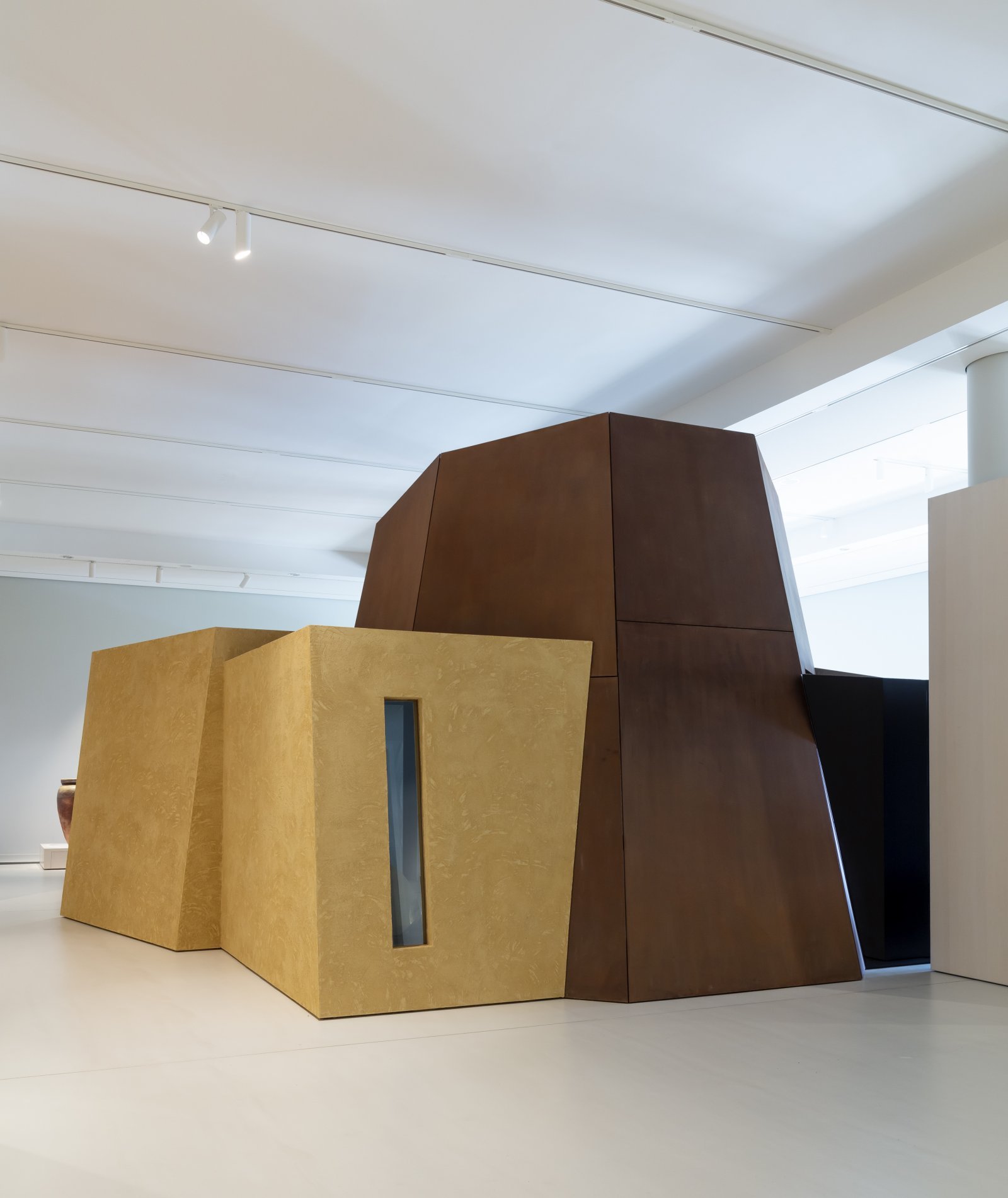 日独160周年を記念して行われたコンペで選ばれた、金沢に拠点を置く浦建築研究所が設計を担当。同じく金沢在住の陶芸家や蒔絵師などとともに完成させたこの茶室「忘機庵」は、一見して茶室とはわからない不思議な形をしている。表面に錆加工を施した、金属製の八角形の小部屋。このフォルムは、ベルリンの歴史を刻む建築からインスピレーションを得て生まれたものなのだ。