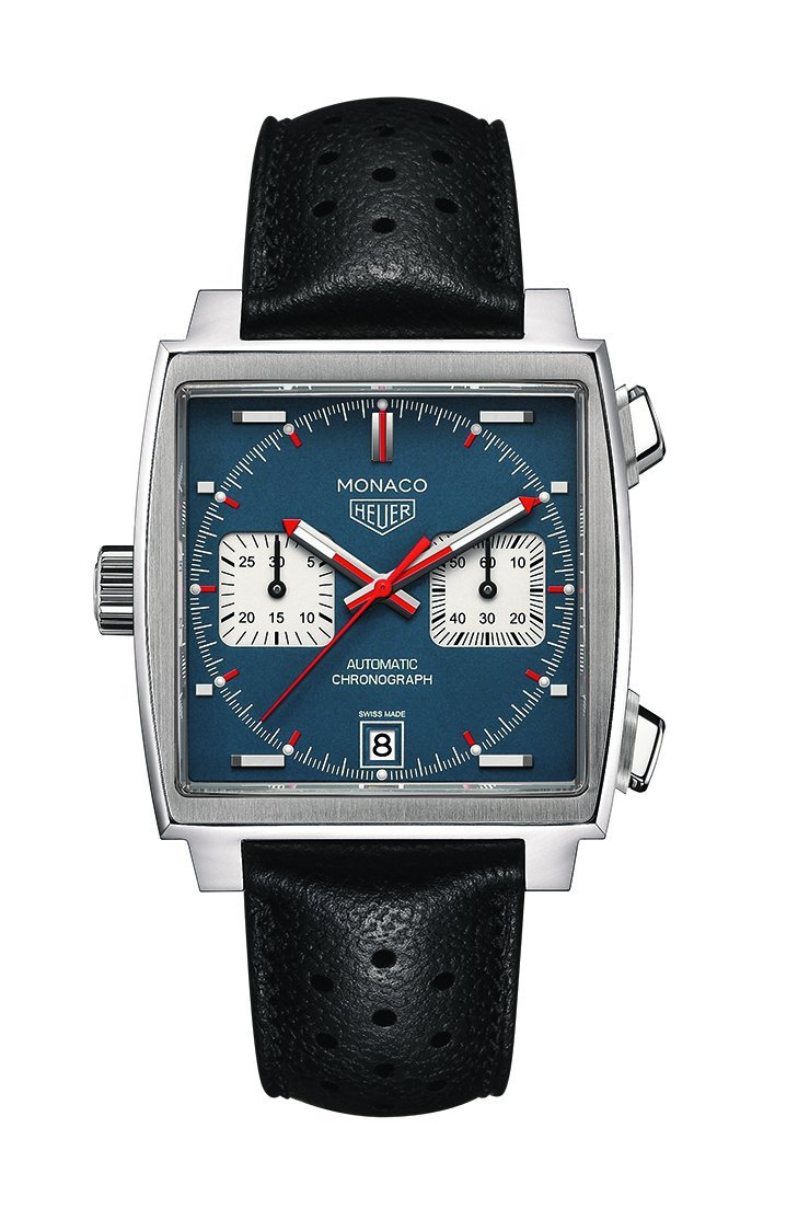 タグ・ホイヤーは、かつてホイヤーというブランド名でした。その当時、斬新な四角いケースに収められた防水型の自動巻きクロノグラフとして1969年に登場したのがモナコ。F−1マシンが公道でレースする、地中海沿岸にある国の名前を冠したモデルです。その人気に火がついたのは、映画『栄光のル・マン』でスティーブ・マックイーンが腕にしていたことによりますが、クオーツ式腕時計の市場侵略などの影響により70年代後半に販売終了。その約20年後に限定復活して以降、次々と現代に蘇らせました。そして2015年、初代デザインを忠実に再現したモデルが本品です。
