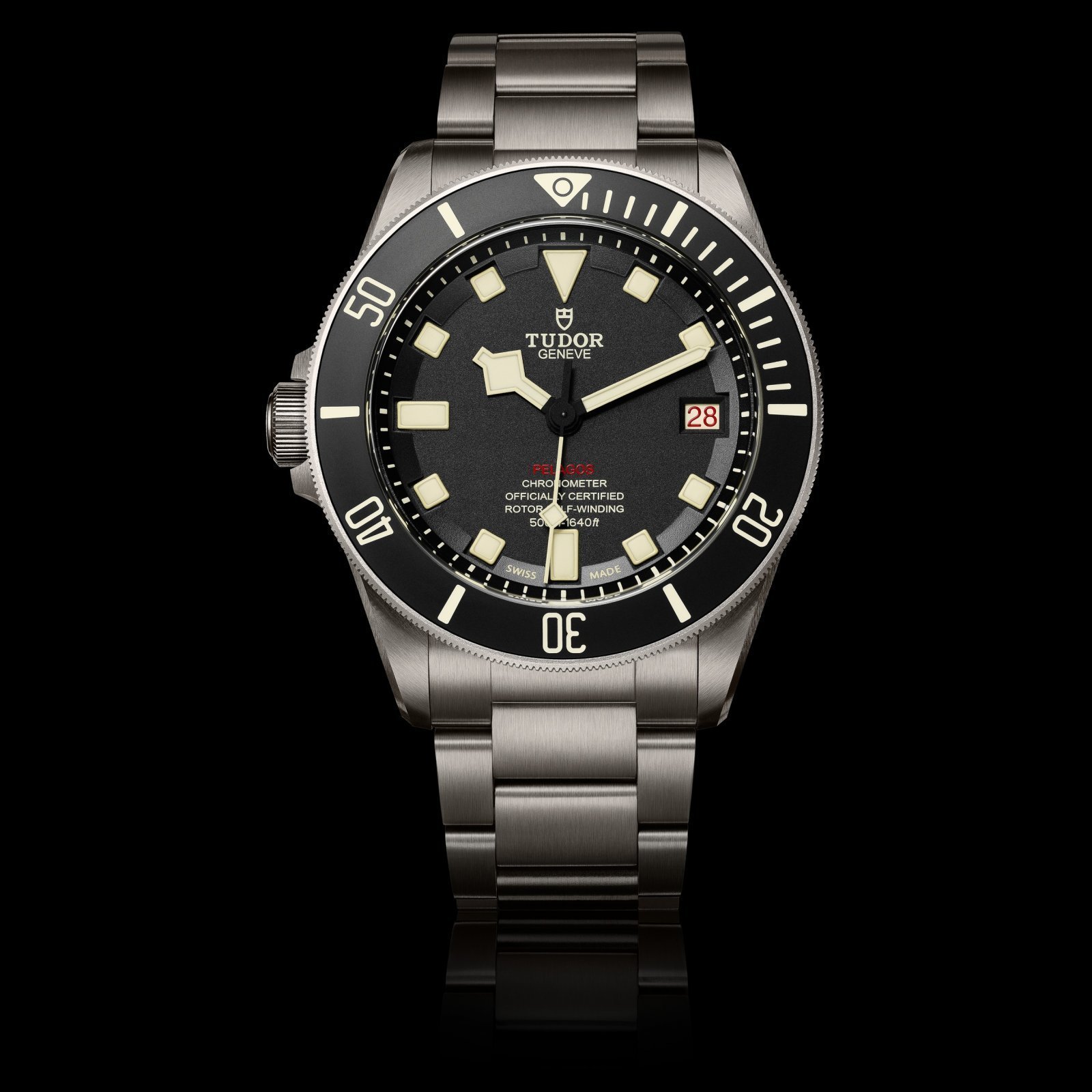 多くの軍隊や冒険家から愛されてきた「チューダー」。その堅牢性は、ブランドロゴの盾のマークに現れている。同社には過去のスタイルを継承する人気ダイバーズウォッチ「フィフティ-エイト」が有名だが、今回紹介したいのは「ペラゴス」。「ペラゴス LHD」は、1970年代にチューダーが、フランス海軍の要請を受けて9時位置側にリューズを配する左利き用のダイバーズウォッチを開発したことに由来している。デザイン的にはリューズが逆にあるだけなのだが、そこにはダイバーたちをサポートするための潜水計器を作るという強い信念が見え隠れしている。道具のようなタフな存在感が宿っており、まさに本気のダイバーズウォッチなのである。