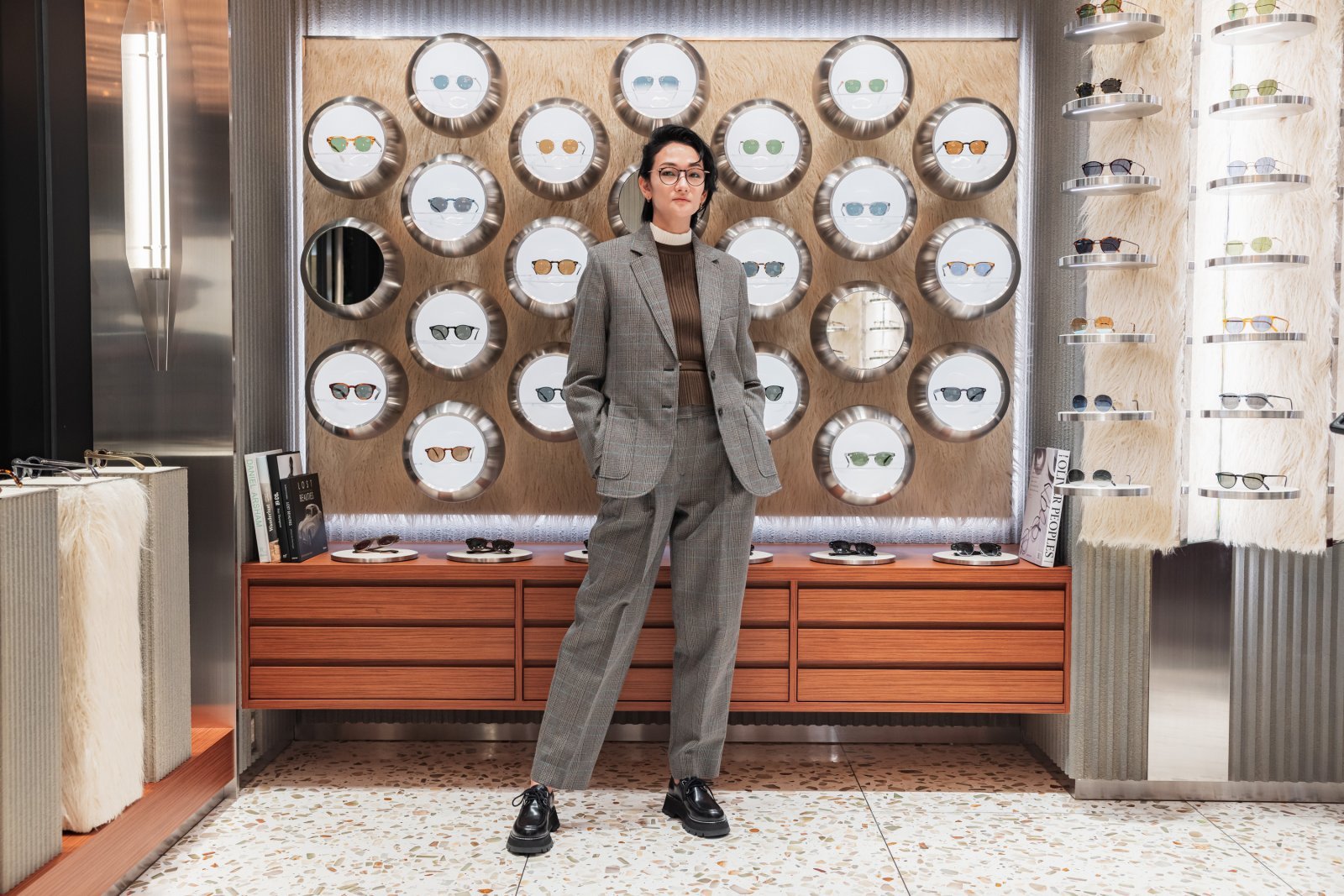 内装は、70年代の宇宙開拓時代のインスピレーションとカリフォルニアの雰囲気を併せもったデザインとなっている。ブティック全体の壁面には、個々に独立した球体型ディスプレイにアイウエアが美しく並ぶ特徴的なデザインを採用し、一つひとつのアイテムを効果的に陳列しながらも統一感のある、ギャラリーのような体験を提供する空間だ。