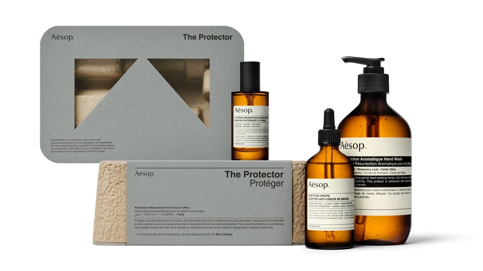 そのイソップは毎年恒例で年末にギフトキットをリリースしている。2021年11月1日(月)に発売される今回は、5種類のバリエーションが用意された。そのなかで男性や家族に贈るのに最適な一品を紹介しよう。家生活を愉しむウィズ コロナ時代のベストチョイスといえる、「プロテクター」である。