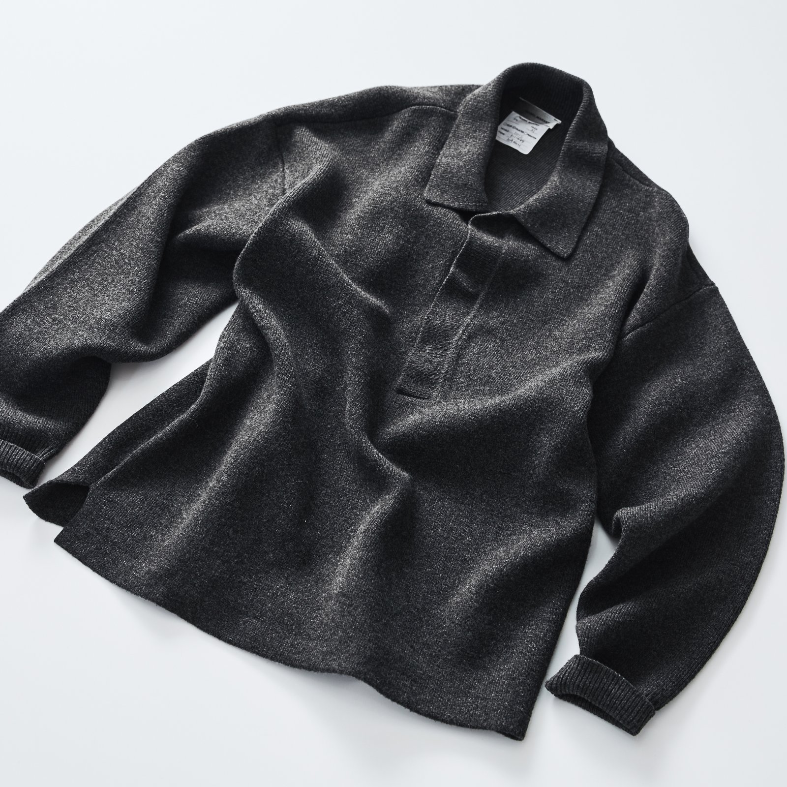 例えば、ラガーシャツ。ビッグシルエットでリラックス感たっぷりに着こなせる。のみならず、アームホールにクリースを入れて、丸みのある、ここらしい柔らかさが引き立つ仕立てとなっている。ハリのある地厚なウール素材も迫力あるシルエットに貢献。落ち着いたチャコールゆえ、大人でも取り入れやすいのもうれしいポイントだ。