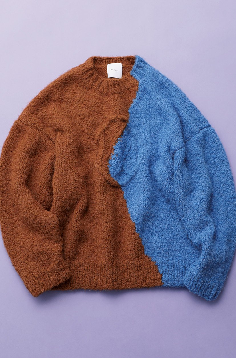 1970年代のニューヨークで活躍した美術家ゴードン・マッタ=クラーク。建築物に大きな穴を開ける大胆な作風で知られるが、その穴をニットの編み地で表現した一着。ケーブル柄と色の切り替え部分は機械では難しいため、手編みで成形。時間と技術を惜しみなく注ぎ込んだ。¥108,900(税込)/コウタ グシケン(コウタ グシケン eメール:info@kotagushiken.com)