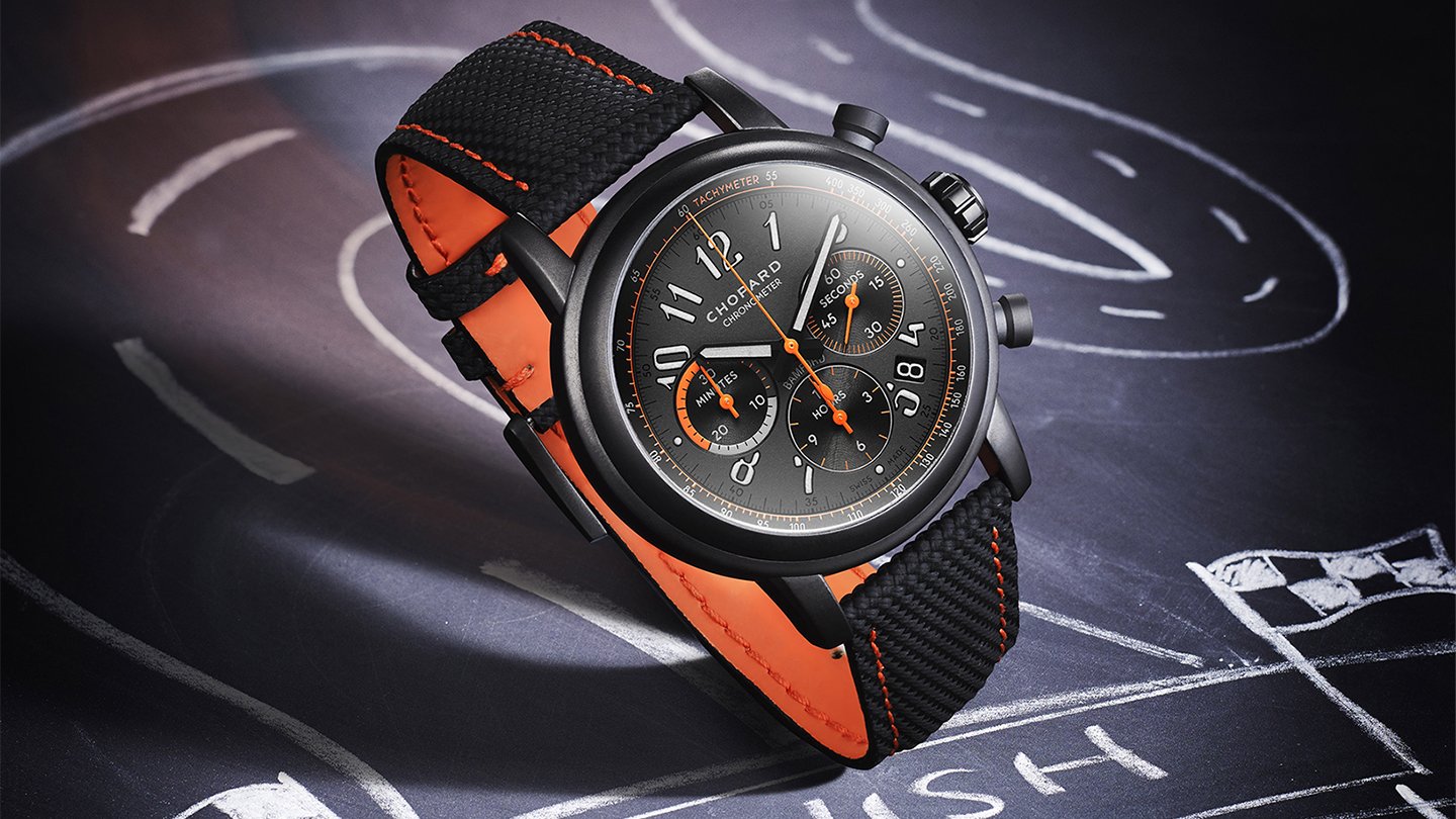 マットなダークグレーのケースとダイヤルに、鮮やかなコントラストのオレンジを要所にコンビネーション。ショパールの「ミッレ ミリア」は、イタリアで開催される同名のクラシックカーレースを記念して1988年から製作されてきたが、これまで見たことのない個性的なカラーリングの新作クロノグラフが登場した。