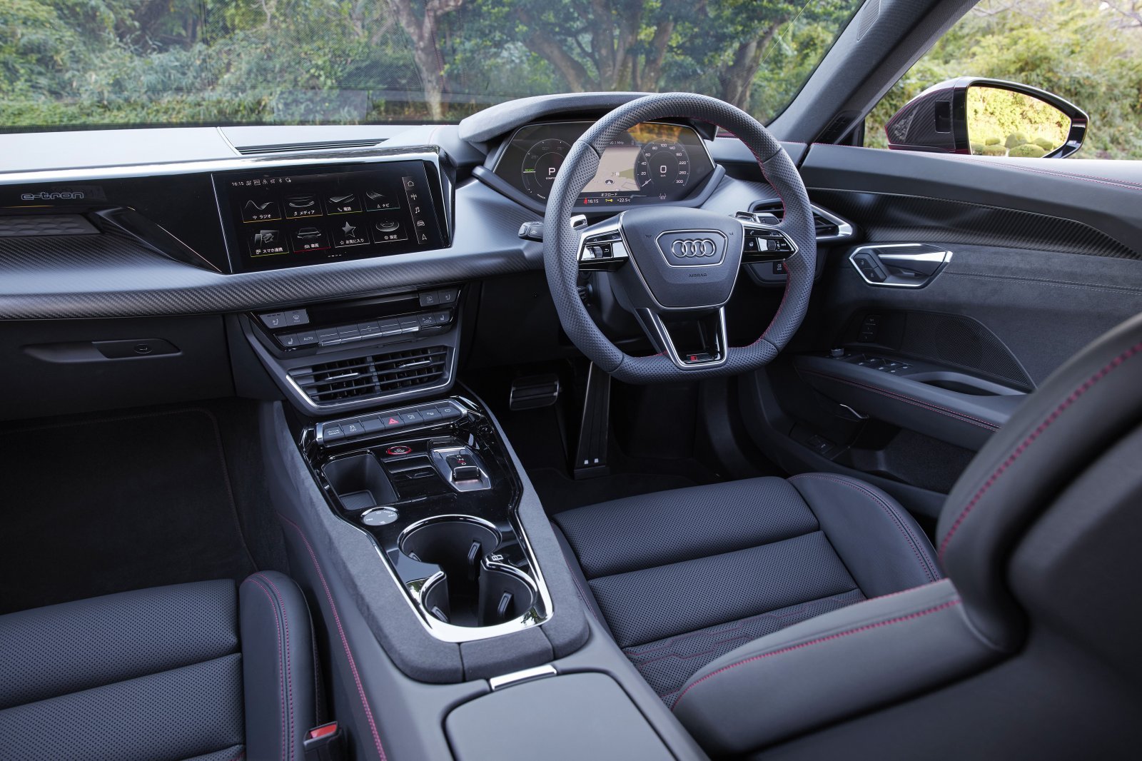 アウディ車に乗った経験があるひとなら、e-tron GTになんの違和感もなく乗れるはず。そしてRS e-tron GTは、スポーティなアウディRSシリーズと同様に、しっかりからだをホールドするヘッドレスト一体型バケットシートや、スウェードを使ったなかなかいいかんじのセンスを感じさせるダッシュボードなどをもつ。