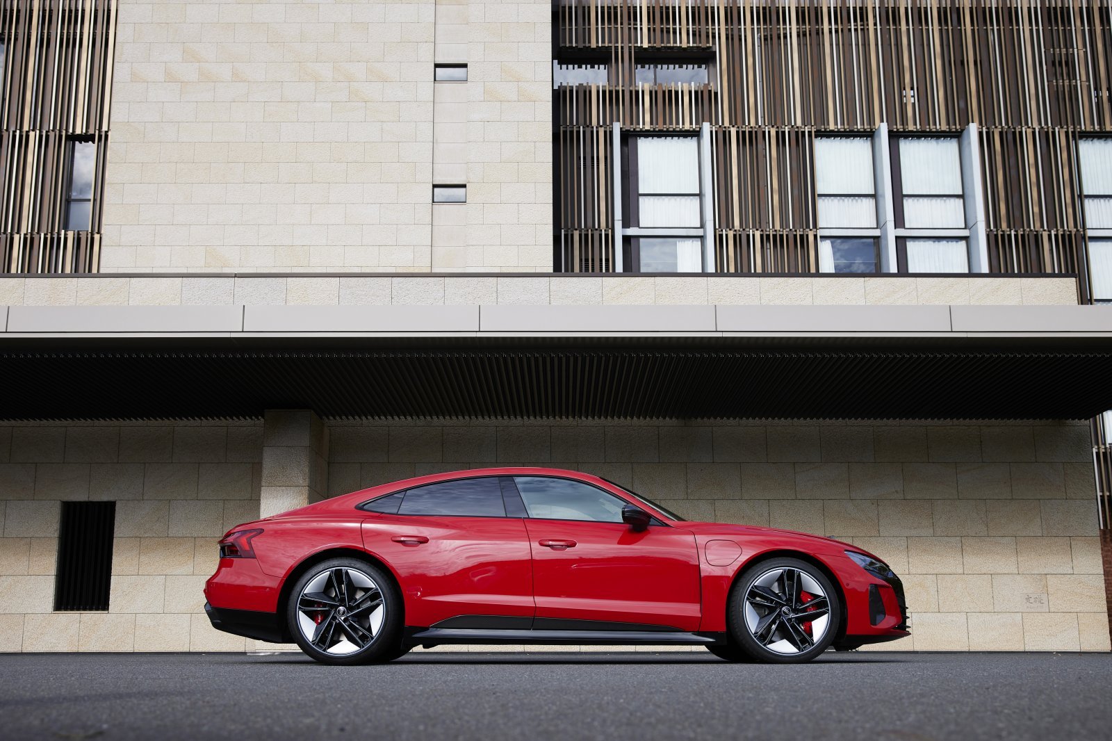 側面は、クーペ的な雰囲気。ルーフ後端からトランクの端までリアウィンドウをゆるやかに寝かした、いわゆるファストバックスタイルだ。アウディA7スポーツバックなどを思わせるアウディならではのスタイル。ただしe-tron GTはハッチバックでなく、トランクは独立している。
