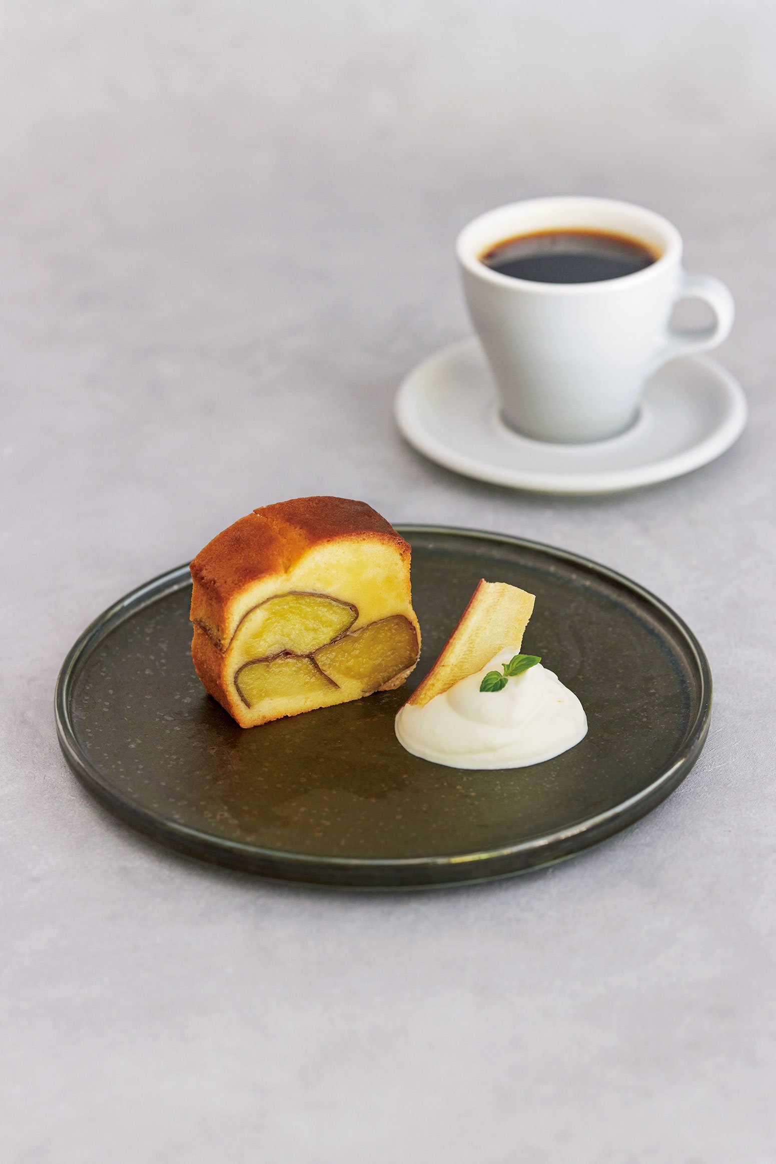 独自の手法で熟成し焼き上げた宮崎産の紅はるかは、しっとりと瑞々しい。熟成焼き芋が主役のテリーヌは、フレンチレストラン「釜津田」との共同開発で生まれたスイーツだ。無添加で仕上げ、和三盆の優しい甘さを湛えたアーモンド香る生地が、熟成焼き芋の濃厚な風味を引き立てる。オーガニックコーヒーや紅茶と合わせて堪能したい。