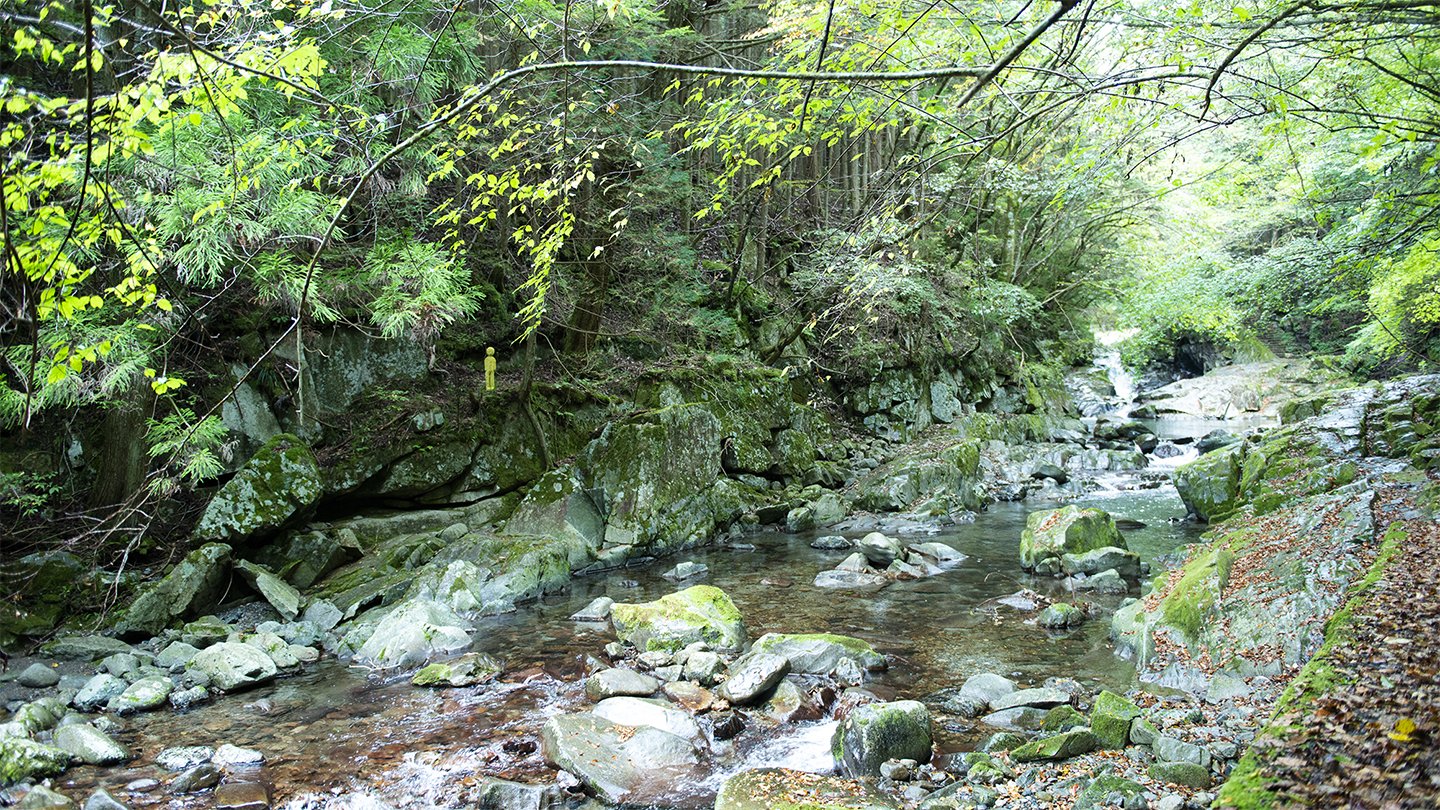 山道を歩いていると川のせせらぎが聞こえ、コースにはいくつかの吊り橋もあり、天川村が本当に水の豊かな土地であることがわかる。およそ1300年前に役行者が開祖となった修験道の山伏たちが、自他の再生と救済のために修行する険しい岩壁などはもちろんコースに含まれていないが、それでも体力を使って歩き、自然の深さを吸い込んでいくことで知覚が開いていくことを自覚できる。