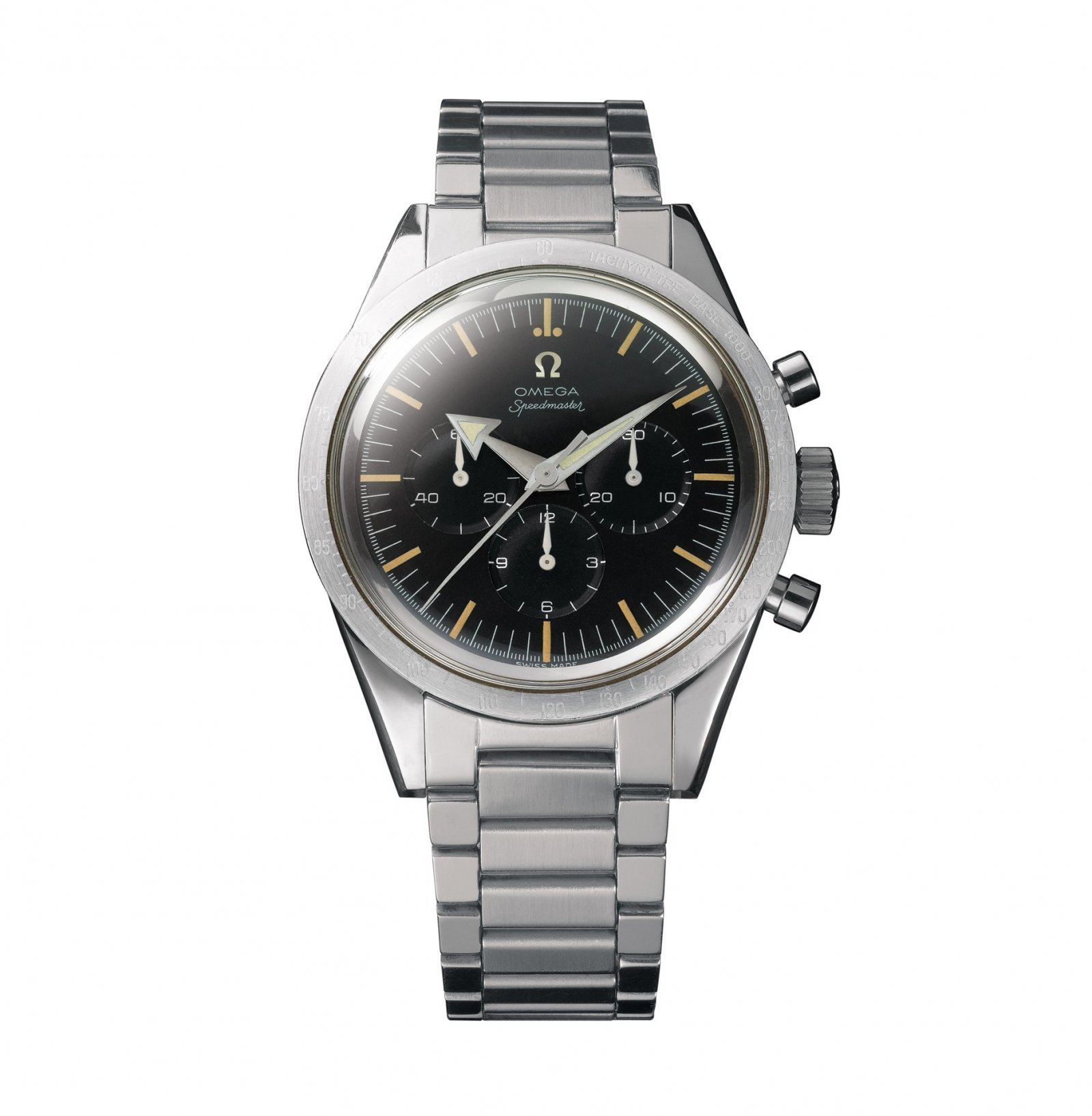 特徴的な針の形状から「ブロードアロー」と呼ばれるこのタイムピースこそ、スピードマスターの原点。これまでのクロノグラフウォッチはタキメーターをダイヤルの外周にデザインするのが一般的だったが、スピードマスターは世界で初めてタキメーターベゼルを開発。より迅速な走行スピードの割り出しを可能にした、まさに画期的な機構。ドライバーの利便性を考えた、これぞ“機能美”だ。