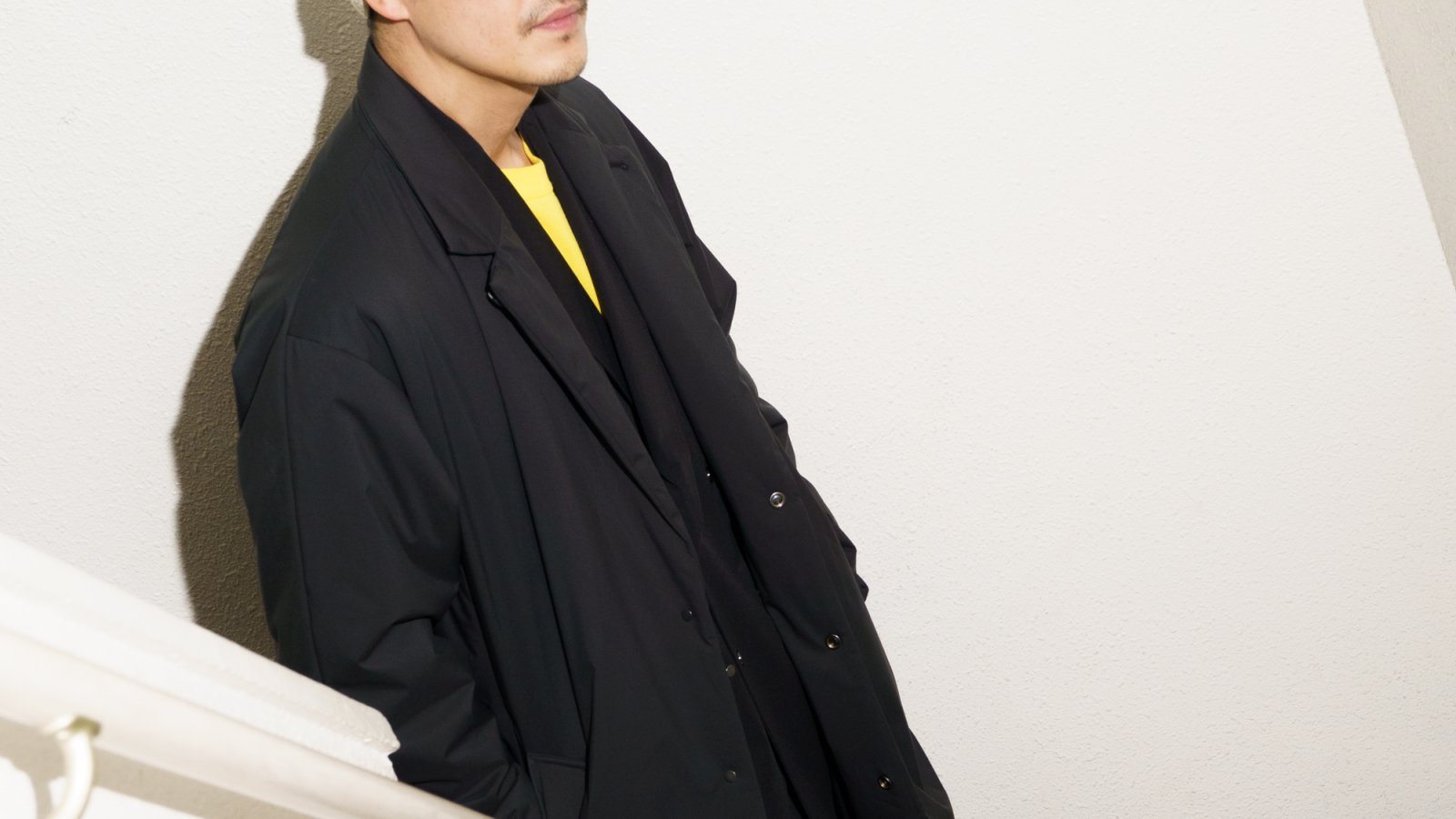 主役のコートの下に着たトップはダブルのテーラードジャケットで、ボトムはスウエットパンツ。