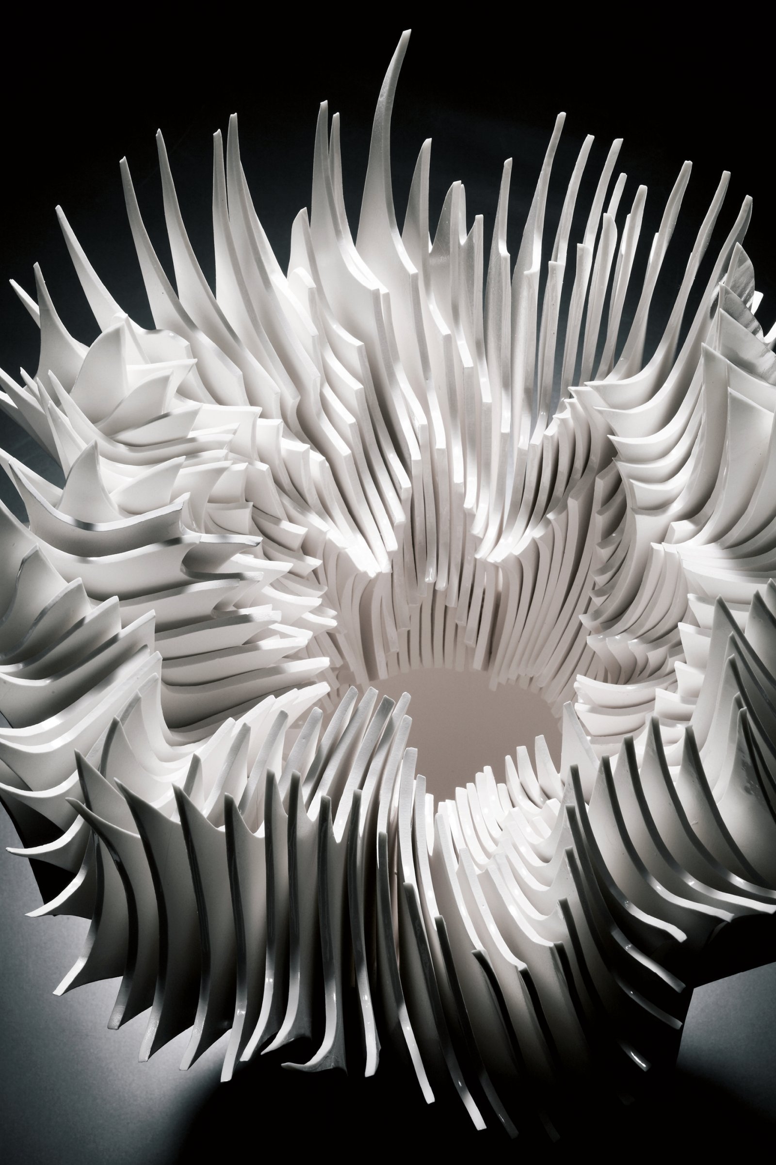 その言葉通り、奈良祐希は陶芸と建築の世界をボーダレスに行き来する。実家は金沢の大樋長左衛門窯。京都の樂家から分家した350年以上続く茶陶の名門に生まれ、東京藝術大学大学院美術研究科建築専攻を首席で卒業。建築で使われる3DCADやプログラミングといった最先端テクノロジーと、陶芸の伝統的な技法を融合させた制作方法で、繊細かつ大胆な作品をつくり出す。