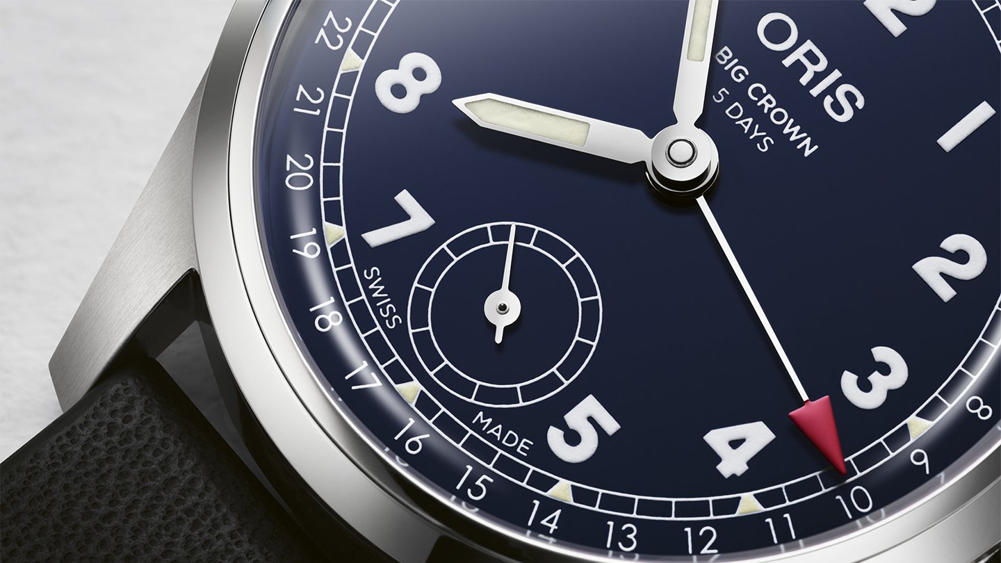新作のベースモデルとなった「ビッグクラウンポインターデイト」は、1938年に発表されてから80年以上の歴史を誇る。パイロットがグローブのままでも操作できるように大ぶりにしたリューズ(ビッグクラウン)と、ダイヤル最外周に日付表示をもつポインターデイトが特徴だ。日付表示は現在は小窓の数字が常識的だが、実はポインターデイトのほうが先輩にあたる。1カ月の経過が流れとして把握できるだけでなく、ダイヤルに穴がないことを評価する時計マニアもいるようだ。