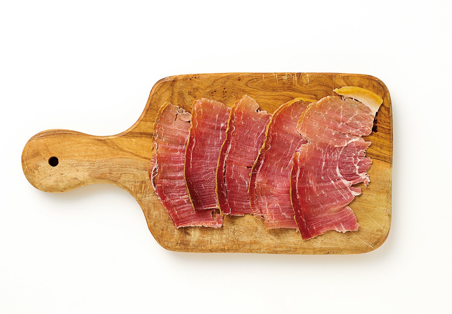 群馬のみなかみ町で60年続く精肉店「育風堂」。長期熟成生ハム「はもんみなかみ」は、ぐんま麦豚の骨付き腿肉を12カ月熟成させた本格派の生ハムで、ミニ原木は特別な日にお薦めの一品だ。天然海塩と谷川岳のからっ風で仕込んだ生ハムは、ほどよい塩味と芳醇な熟成香が特徴。舌にのせると脂が溶けてナッツのような甘みが広がり、ワインが進む。特別な日にはハモネロ(木製の台座)とナイフ付きのセットで雰囲気を出すのもオツ。