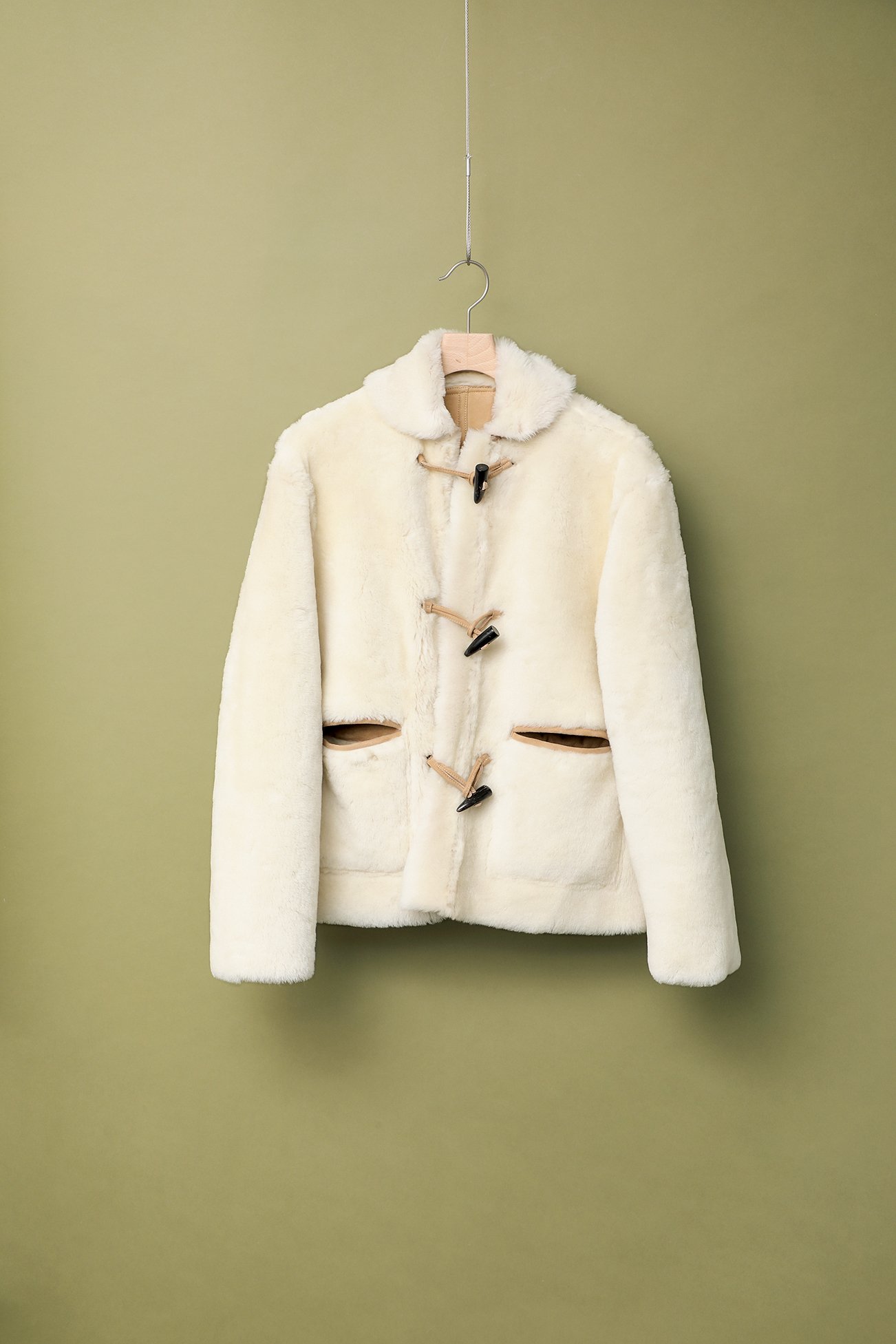 ヴィンテージのミリタリーショートダッフルをムートンで再解釈。イタリアMOTTA社でなめされたムートンを使用し、熟練の職人によって革の裁断から縫製までを手がけた逸品。たび重なる試作の末、撥水加工も施している。毛皮とレザーのリバーシブル仕様で、毛皮面は視覚的にも体感的にもかなり暖か。¥242,000(税込)/シーオール(シーオール https://seeall.jp)