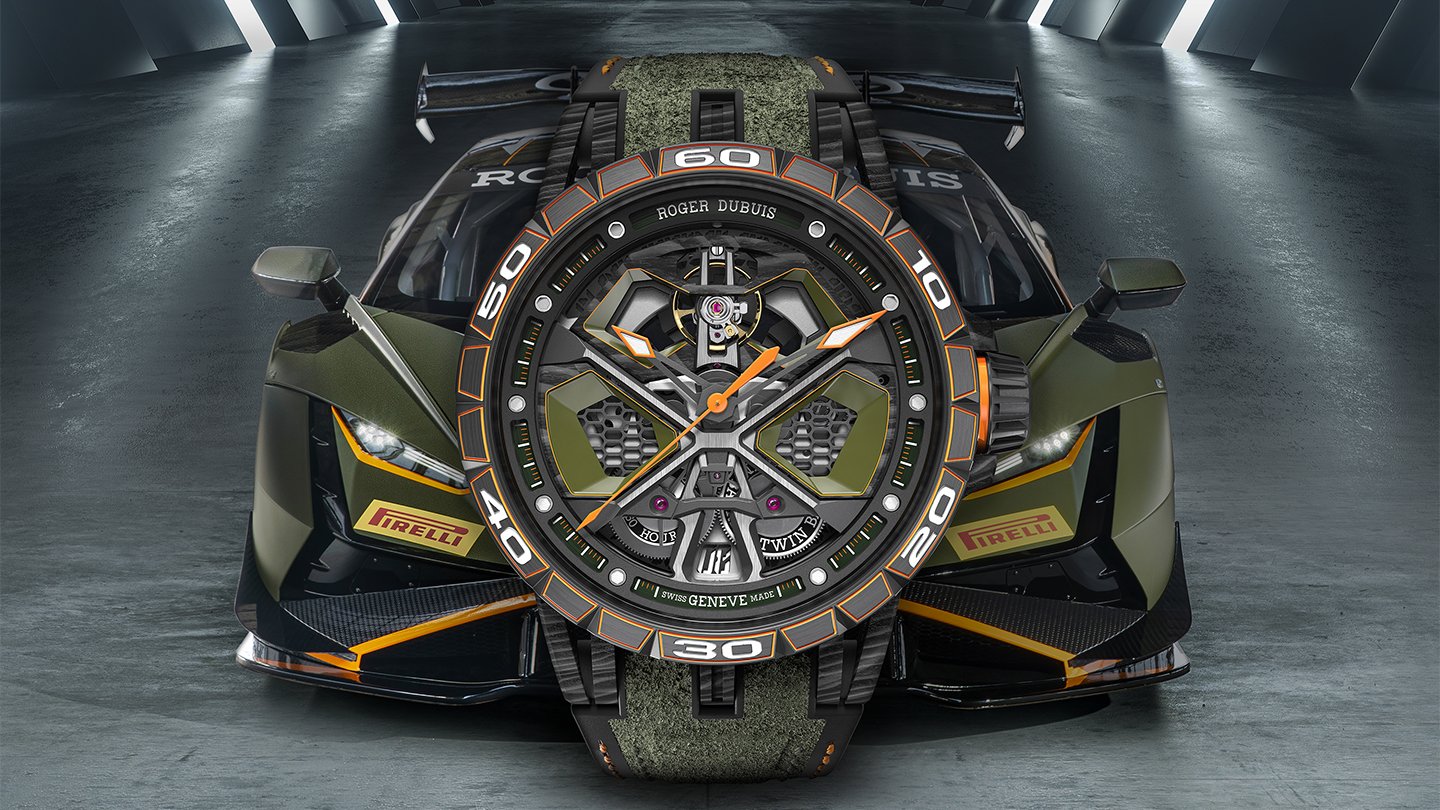 時計とクルマのコラボレーションは珍しくないが、これほどアバンギャルドなモデルは、さすがロジェ・デュブイというほかない。2017年からランボルギーニのレース部門であるスクアドラ・コルセと提携し、独創的なスタイルの限定モデルを発表してきたが、今回新たに登場したのはカーキグリーンにオレンジのアウトラインで彩られた「エクスカリバー スパイダー ウラカン EVO2」だ。
