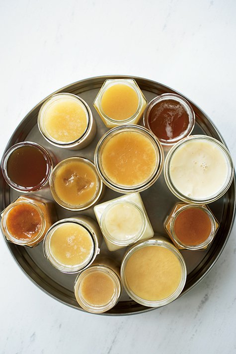 「ワインのテロワール同様、ハチミツにも土地や季節によって味や香りに違いがあることを知ってほしい」と話すクリンケン。北欧では結晶化した白いポマードのようなハチミツが好まれる。店内にはこうした商品を中心に、養蜂家ネットワークを通じて集められた多種のハチミツ(写真下左)が並ぶ。なかには陶芸家とコラボした保存容器やハチミツ酒「ミード」なども並び、ハチミツの奥深さに驚かされる。