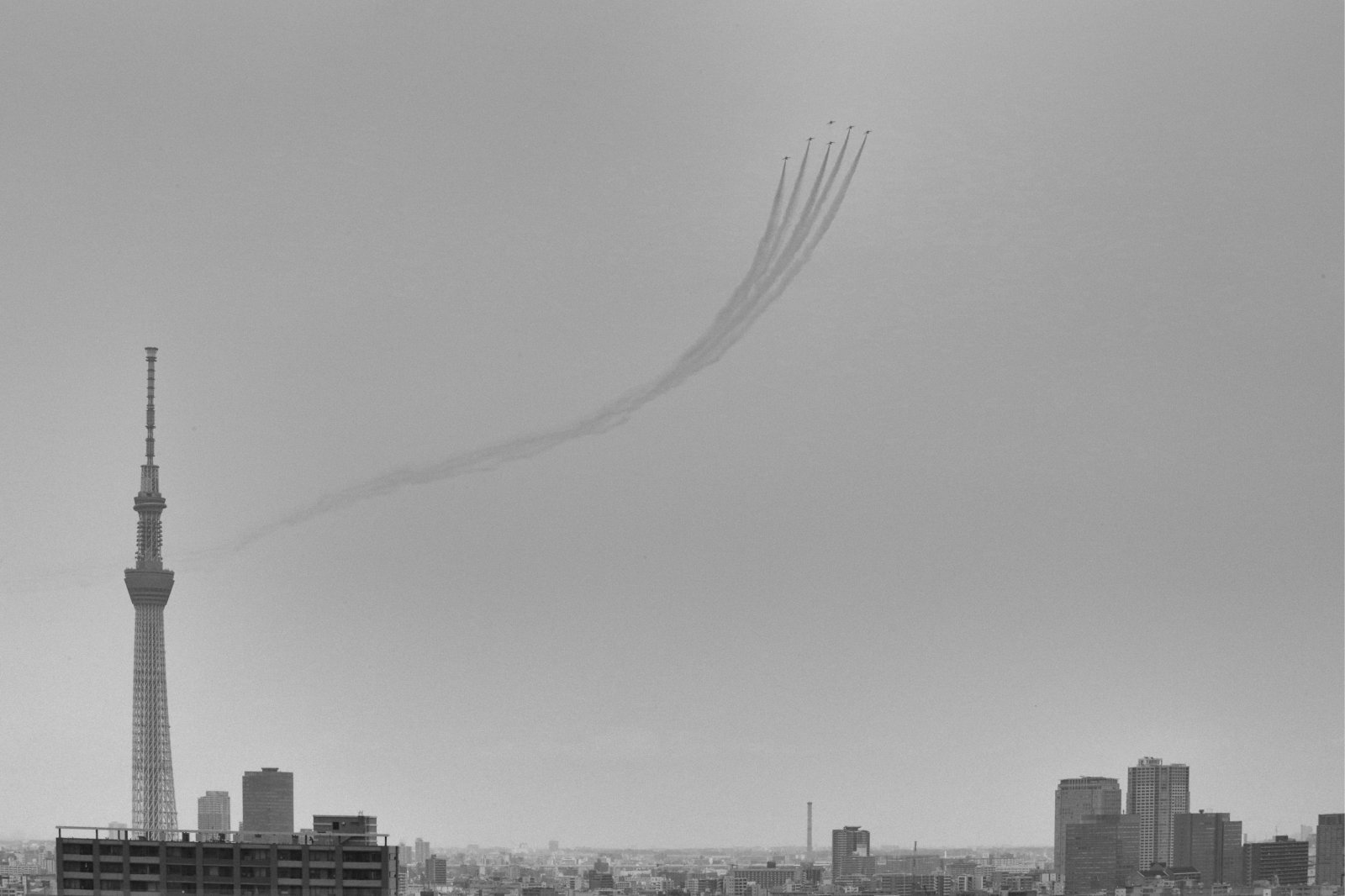 窓ガラス越しに広がる東京の東側のうっすら曇った光景を、一眼レフの光学式ファインダーで覗き見る。その感覚は、リアルタイムで起きている事象なのに現実としての手触りが淡く、視覚的にもコントラストの低い体験でした。初代のノースアメリカンF86戦闘機、二代目の三菱重工T2、そして現役の川崎重工T4によるブルーインパルスの飛行をすべて肉眼で見てきましたが、今回の遭遇が最も淡い感じがしたのが不思議です。