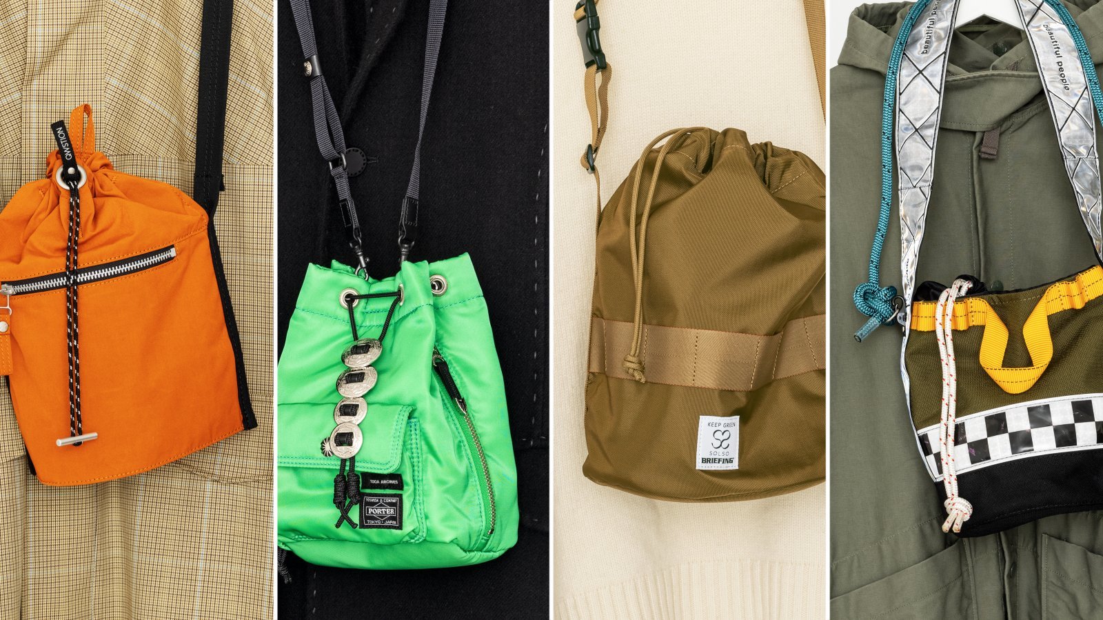 そこでいま注目される筆頭株が、一昔前なら女性的とされた小型巾着バッグ。サコッシュの流れを汲んだ日常使いアイテムである。電子化で書類を持ち歩くことが減り、大きな四角いバッグは不要になった。マチ幅がある巾着はイヤホンケースや充電器などかさばる機器の収納にも適している。さらに丸いフォルムは、冬の重い服装を軽やかに見せる演出力にも長けている。ワードローブに加えない手はないアイテムなのだ。