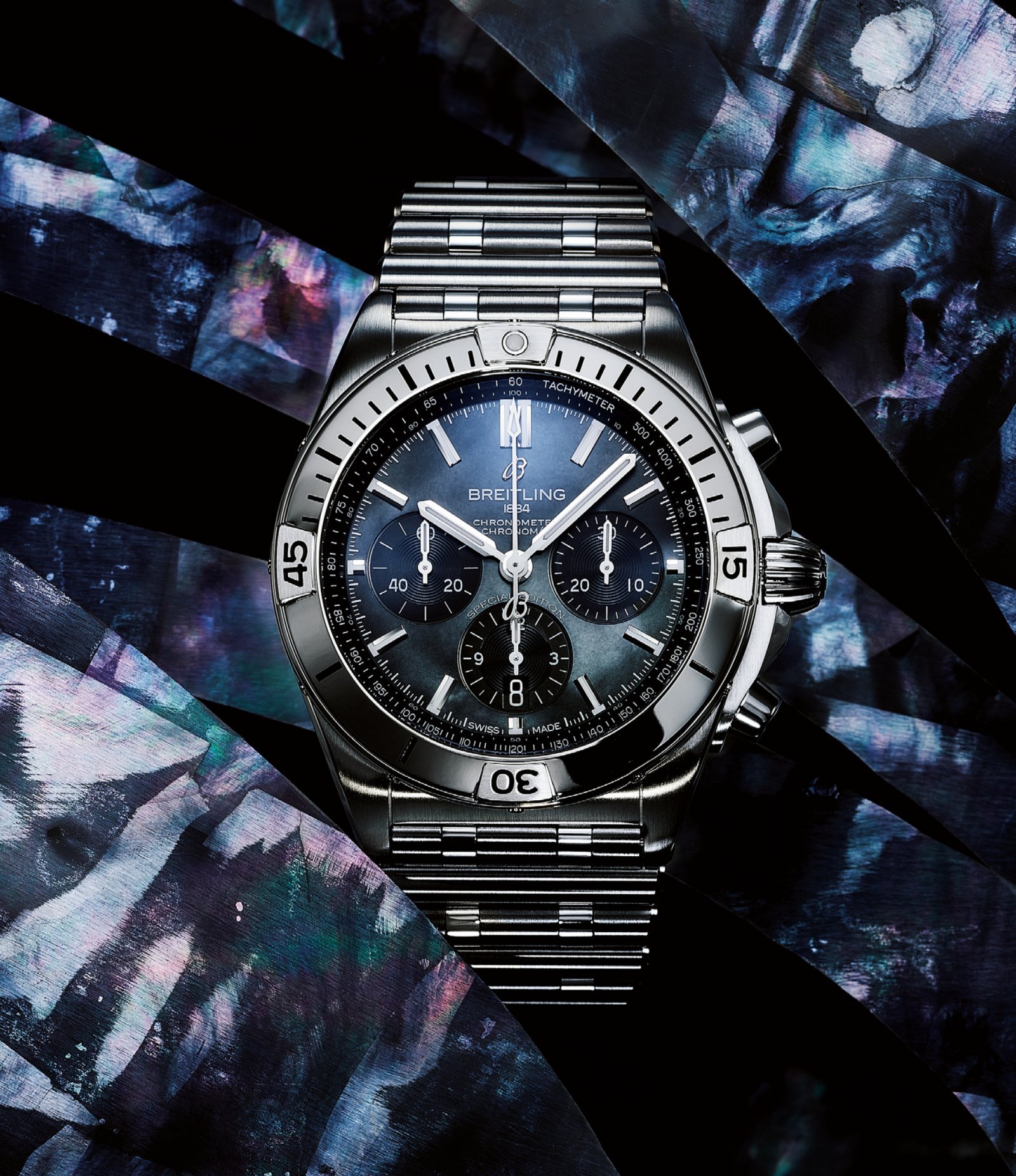 MOPダイヤルといえば、従来は白蝶貝による乳白色が定番であった。光の反射で虹色に煌く華やかさもあって、上品なドレスウォッチやレディスウォッチに用いられてきたが、これをスポーツモデルに採用した先駆けがブライトリングだ。特に2000年以降、黒蝶貝を用いた日本限定モデルを展開し人気を博してきたが、ブラックMOPダイヤルは、エレガントな美しさの中に、力強い印象や大人の色香さえも感じさせる。