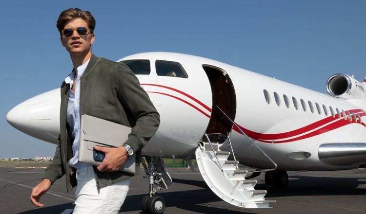 航空業界にオマージュを捧げる意味で「ホワイト ホーク」と命名。背後のジェット機は着想源となったフランス・ダッソー社の「ファルコン 8X」。3発のエンジンを尾翼付近に搭載した、乗客定員19名のビジネスジェットであり、ホワイトのボディに流れるようなレッドのラインが印象的だ。