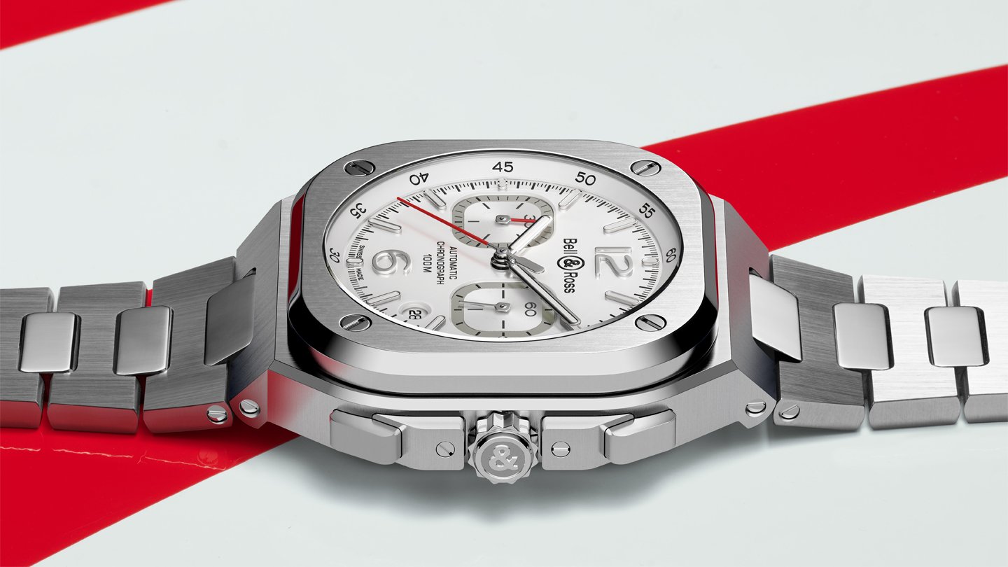 幾何学の基本的な図形である四角と丸を絶妙なセンスで組み合わせたベル&ロス「BR 05」に、クロノグラフが追加されたのは2020年。ダイヤルカラーはブルーとブラックの2種類だったが、2021年末にホワイトダイヤルの「BR 05 クロノ ホワイト ホーク」がリリースされた。シルバーダイヤルに微細な粒子状のホワイトオパーリン仕上げを施しており、乱反射を抑制した乳白色が上品で美しい。ステンレス・スチールのメタリックシルバーに包まれたクロノグラフとホワイトダイヤルとの相性は、意外にもインパクトが強く、清新な若々しさを感じさせる。