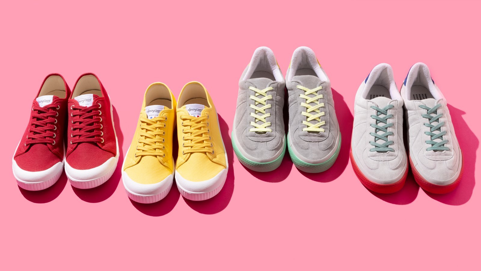 スニーカーは、東京の大人シーンの中軸にいるグラフペーパーが、ミリタリーシューズを再解釈するリプロダクション オブ ファウンドに別注した最新モデル。イギリス人画家デイヴィッド・ホックニーの1960〜70年代の作品をイメージした色が採用されている。定番のジャーマントレーナーがまったく新しい表情に生まれ変わった。
