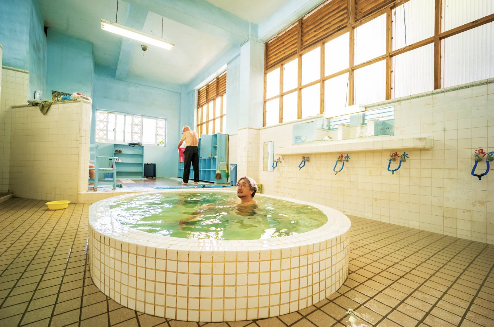 まず主人の人柄にやられた。仲村シゲさん、90歳。1964(昭和39)年に夫婦で創業したものの夫が急逝。以来50年近く、女手ひとつでこの湯を守り続けてきた。午前中に湯を沸かし始め、昼過ぎから営業を開始。夜7時には閉める。それからたったひとりで掃除をして、床に就くのは夜の深い時間となる。入浴料は370円。1日の客はせいぜい数十人。それでもこの仕事を続けているのは、友だちのような客たちに囲まれているためだ。シゲさんの居場所は、番台ではなく暖簾の前のベンチ。訪れた客はシゲさんと何気ない会話を交わして暖簾をくぐる。近所で沖縄古民家民宿を営む野下秀広さんは、いつも三線を手にしてやって来る。湯上がりに、シゲさんに歌を聴かせるためだ。シゲさんも合わせて歌い始め、次に訪れた客も口ずさみながら中に入って行く。それが中乃湯の日常だ。