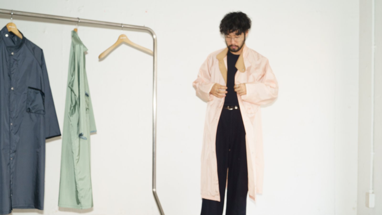 ベースになったのは1940年代の第二次大戦期における、イギリス軍の耐ガス&耐防塵用コート。古着を現代的にアレンジしたのがこの服だ。ポケットは胸にマチ付きがひとつあり、サイドポケットなど一切なし。そんな潔いところも忠実に再現している。ピンク色のモデルは、当時のコートがピンク系だったことからの着想である。